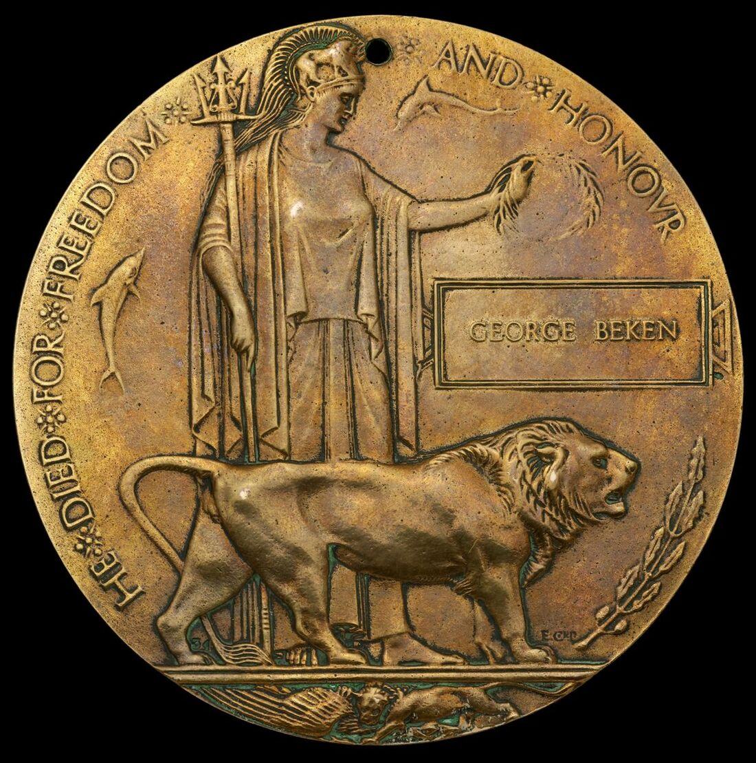 George Beken was born at Deptford, enlisted at Lewisham and served in France from the 16 March 1915 with the East Kent Regiment. He was killed in action on 10 October 1916 and is commemorated at the Guards' Cemetery, Lesboeufs.