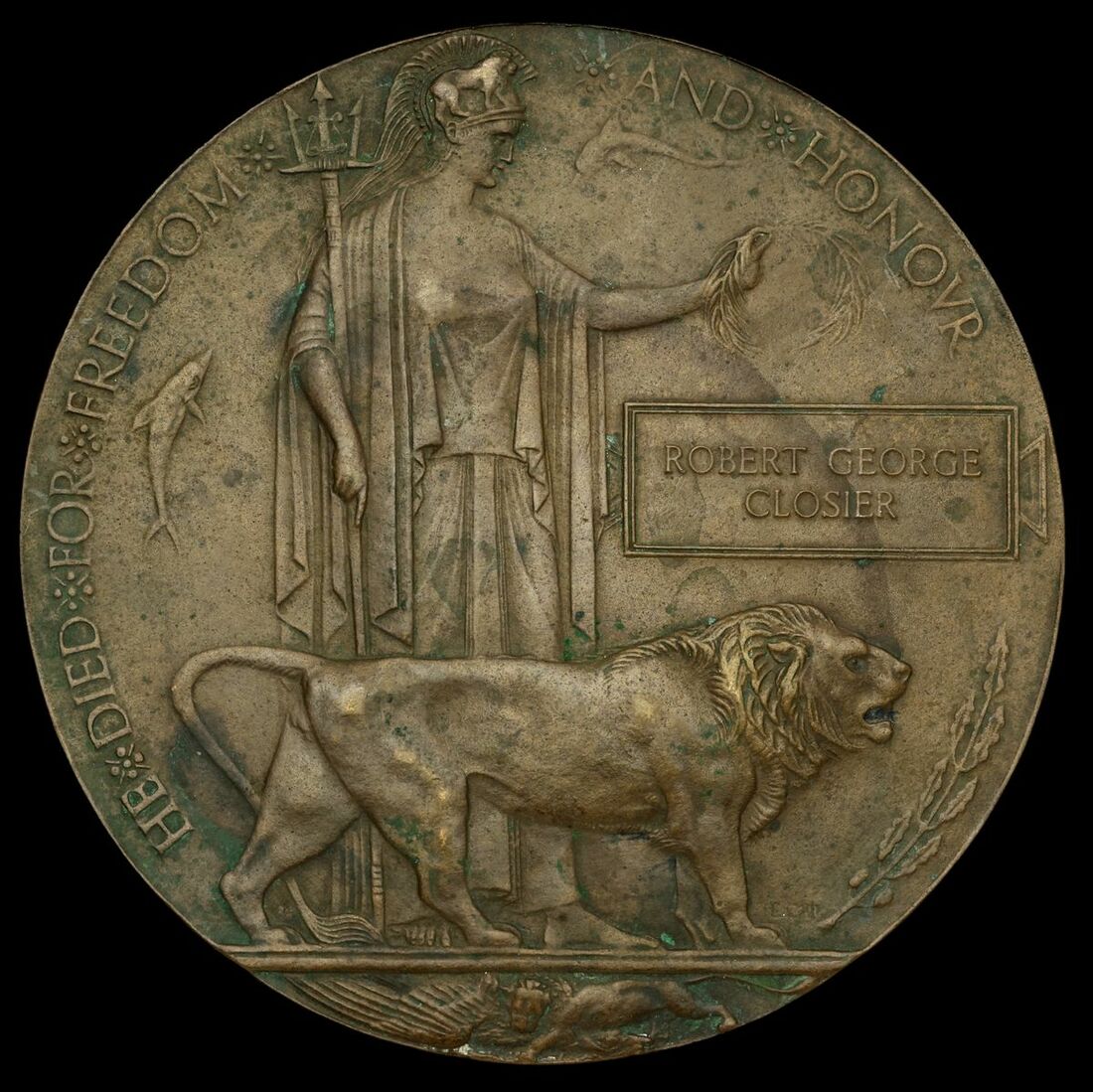 Great War Bronze Memorial Plaque (Robert George Closier), some light verdigris, with glue to reverse, very fine