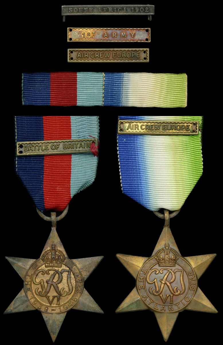 1939-45 Star, clasp Battle of Britain, partially detached; Atlantic Star, clasp, Air Crew Europe; three loose clasps, Air Crew Europe, 1st Army, South Africa 1902, all clasps other than last two copies, overall very fine