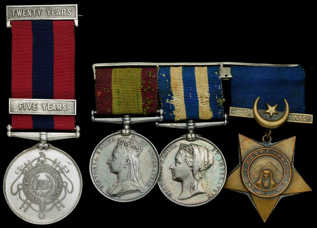 Afghanistan 1878-80, no clasp (998. Pte. Wm. Smith. 63rd Regt.); Egypt and Sudan 1882-89, no clasp (998. Pte. W. Smith. 1/ Manch. R.); Khedive's Star (Pte. W. Smith. 1/Manch: R. 998), engraved naming; National Fire Brigades Association twenty Year Long Service Medal, 1 clasp, five years, (3087 Charles T. Smith.), the first three mounted as worn, the last mounted separately for wear, heavy pitting and contact wear overall, nearly very fine (4)