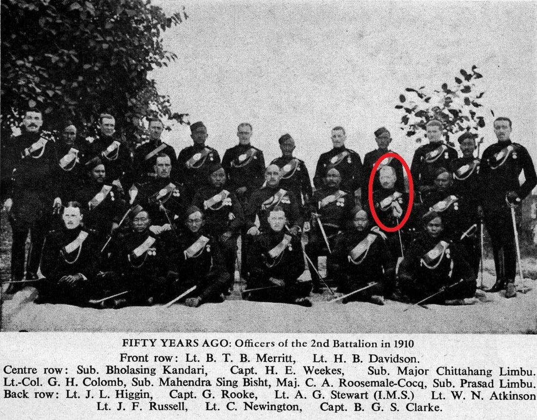 Charles Alexander Roosemale-Cocq was born in 1868 and was appointed 2nd Lieutenant in the 1st (Volunteer) Battalion, Leicestershire Regiment on 6 July 1889. Transferred to the Indian Army and appointed Wing Officer in the 3rd Bombay Light Infantry, 13 December 1890, he served on North West Frontier of India 1897-98 at Malakand, Buner and action of the Tanna Mass. In 1899, he is shown as commanding the Depot 3rd Regiment of Bombay (Light) Infantry and as the Station Staff Officer (SSO) Satara. On 29 November 1901, transferred to the Erinpura Irregular Force as a Wing Officer and serving with the Supply and Transport Corps. Transferred to 10th Gurkha Rifles when it raised its 2nd Battalion in 1908 and to the 1st Battalion 8th Gurkha Rifles in 1914, which he temporary commanded in the rank of Lieutenant-Colonel in Mesopotamia from March-November 1916 [for which he would have been eligible for the British War and Victory Medals and is recorded as such in the Supplement to the Indian Army List January 1924]. He subsequently returned to India to raise the 2nd Reserve Battalion, Gurkha Rifles at the end of 1916, later redesignated 3rd Battalion, 5th Gurkha Rifles (Frontier Force). Handed over command in mid-1917 and thereafter assumed command of the Depot 1st Battalion 8th Gurkha Rifles. He retired in the rank of Lieutenant-Colonel, 20 January 1921.