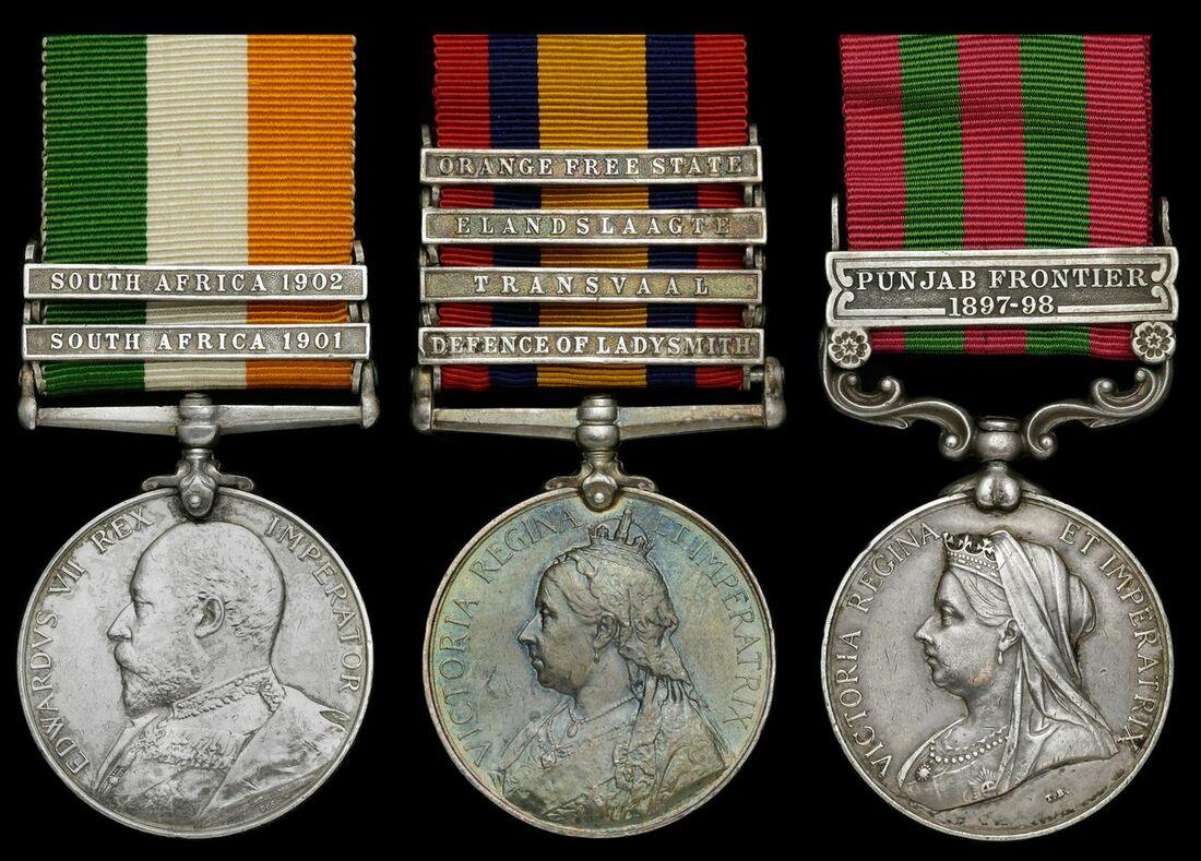 India General Service 1895,1908, 1 clasp, Punjab Frontier 1897-98 (4390 Pte E. J. Buck. 1st Battalion, Devon. Regt); Queen's South Africa 1899-1902, 4 clasps, Defence of Ladysmith, Transvaal, Elandslaagte, Orange Free State (4390 Pte. J. Buck, Devon: Regt.), clasps mounted in that order, King's South Africa 1901-1902, 2 clasps, South Africa 1901, South Africa 1902 (4390 Corpl: E. J. Buck. Devon: Regt.), contact wear, heavy to second nearly very fine, otherwise very fine (3)