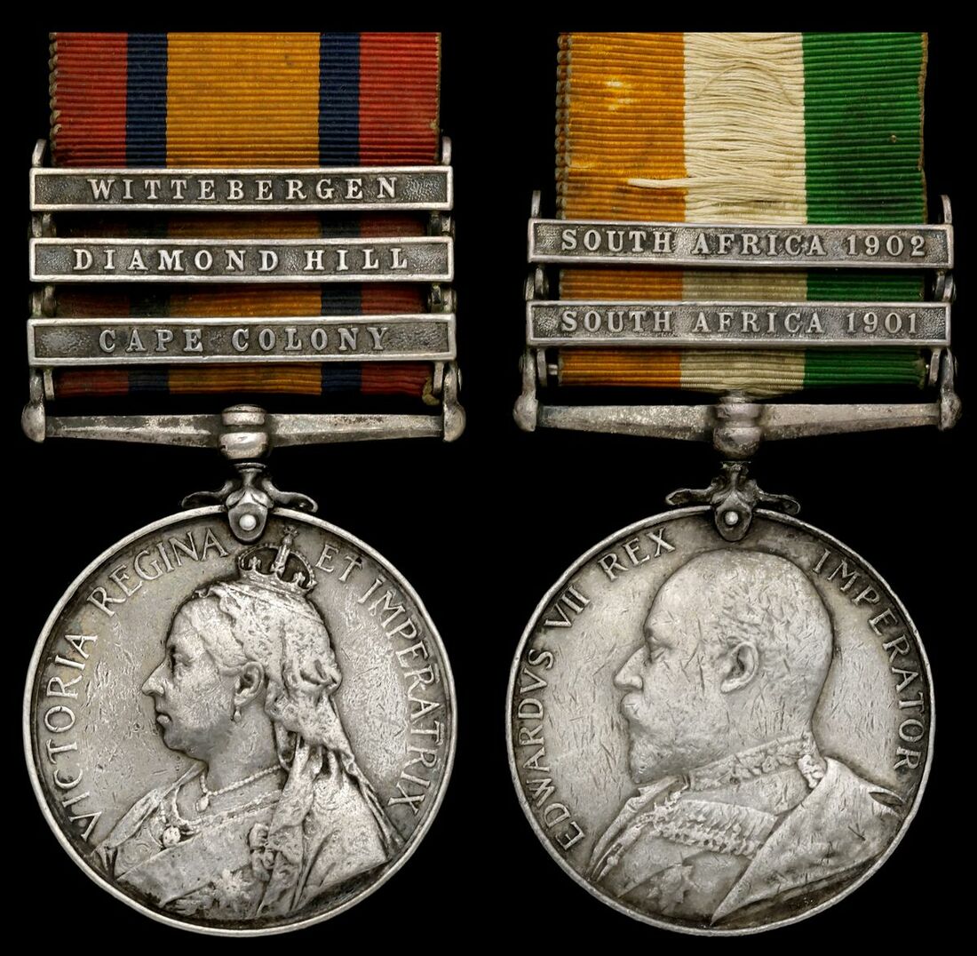 Queen's South Africa Medal 1899-1902, 3 clasps, Cape Colony, Diamond Hill, Wittebergen (3318 Pte G. Jeffery, 1:R:Sussex Regt.) note surname incorrectly rendered; King's South Africa 1901-02, 2 clasps, South Africa 1901, South Africa 1902 (3318 Pte G. Jeffries. Rl: Sussex Regt.), suspension loose, contact marks, contact wear overall, nearly very fine