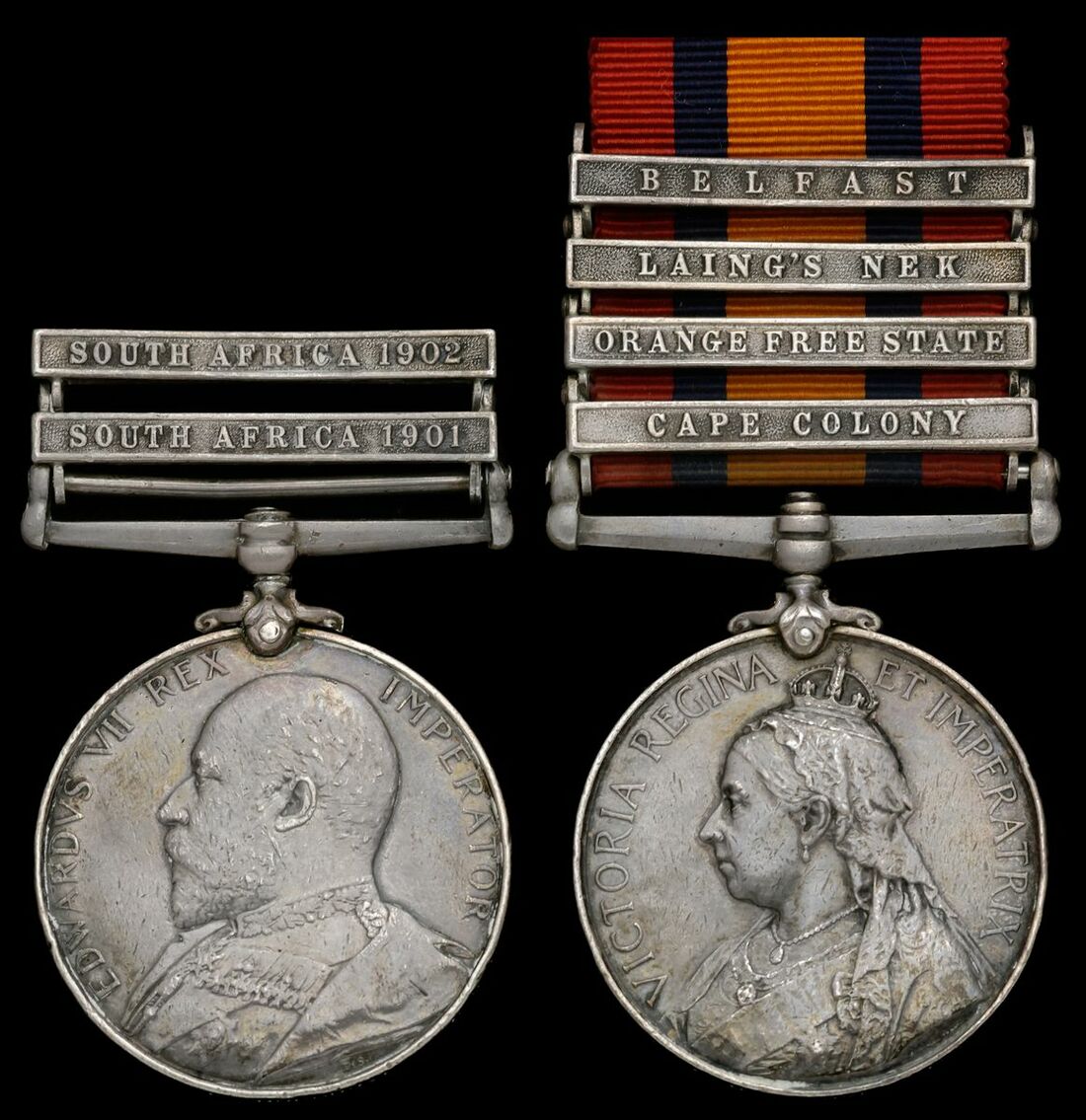 Queen's South Africa 1899-1902, 4 clasps, Cape Colony, Orange Free State, Laing's Nek, Belfast (32514 Gnr: T. Norgrove, 10th Coy W. D., R.G.A.); King's South Africa 1901-02, 2 clasps, South Africa 1901, South Africa 1902 (32514 Gnr: T. Norgrove. R.G.A.), contact marks and wear overall, edge bruise to second, overall nearly very fine (2)
