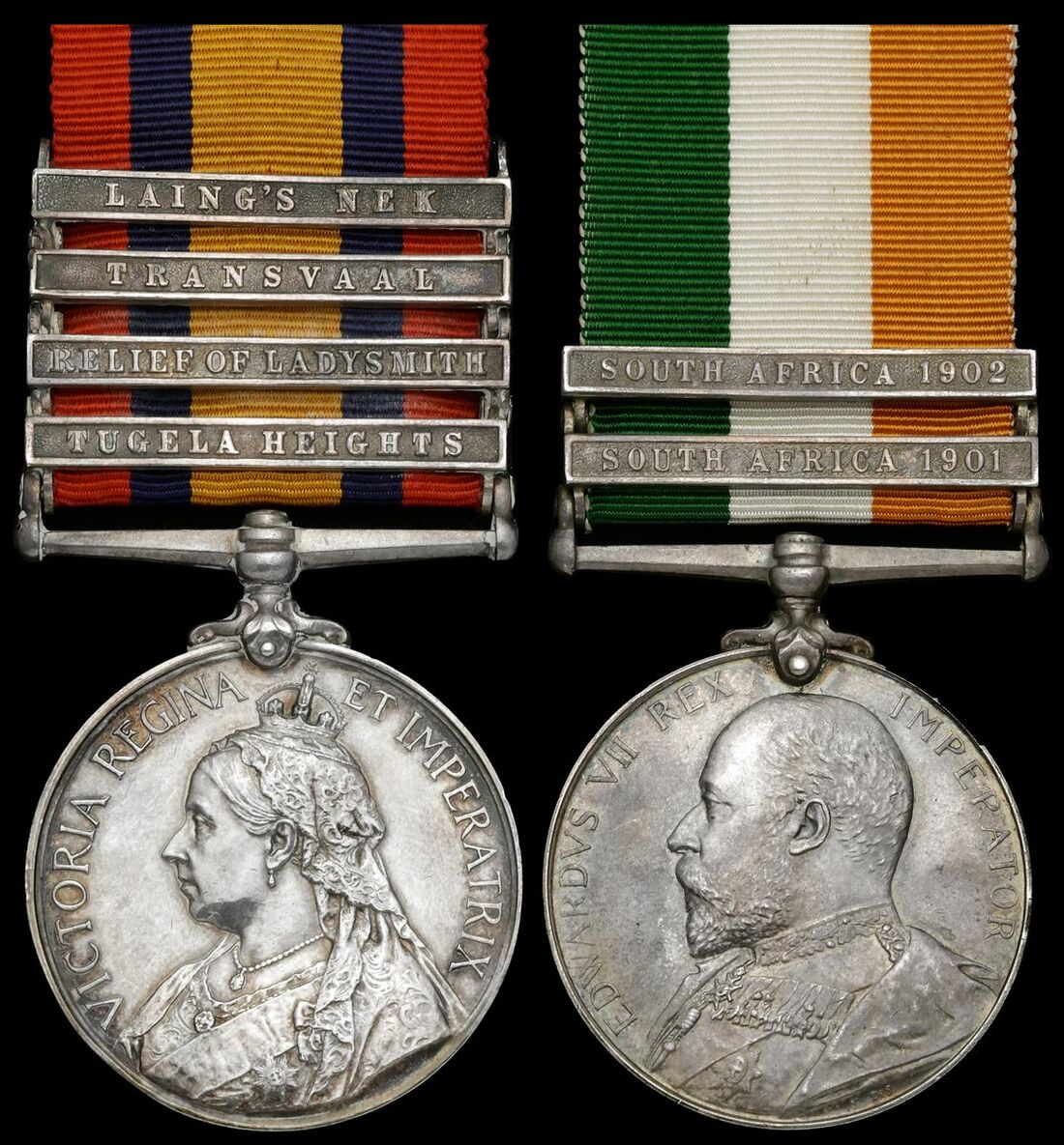 Queen's South Africa 1899-1902, 4 clasps, Tugela Heights, Relief of Ladysmith, Tranvsaal, Laing's Nek (684 Serjt. T. Filmer. Impl: Lt. Infy.); King's South Africa 1901-02, 2 clasps, South Africa 1901, South Africa 1902 (256 Corpl. T. Filmer. Kitchener's F.S.), good very fine (2)