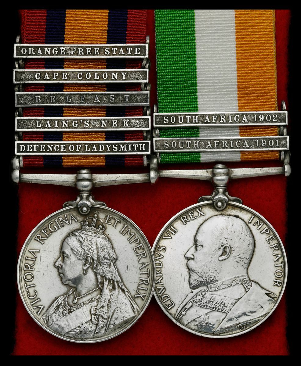 Queen's South Africa 1899-1902, 5 clasps, Defence of Ladysmith, Laing's Nek, Belfast, Cape Colony, Orange Free State (5049 Pte S. Hill, Manchester Regt); King's South Africa 1901-02, 2 clasps, South Africa 1901, South Africa 1902 (5049 Pte S. Hill. Manch: Regt.), minor contact marks, very fine (2)