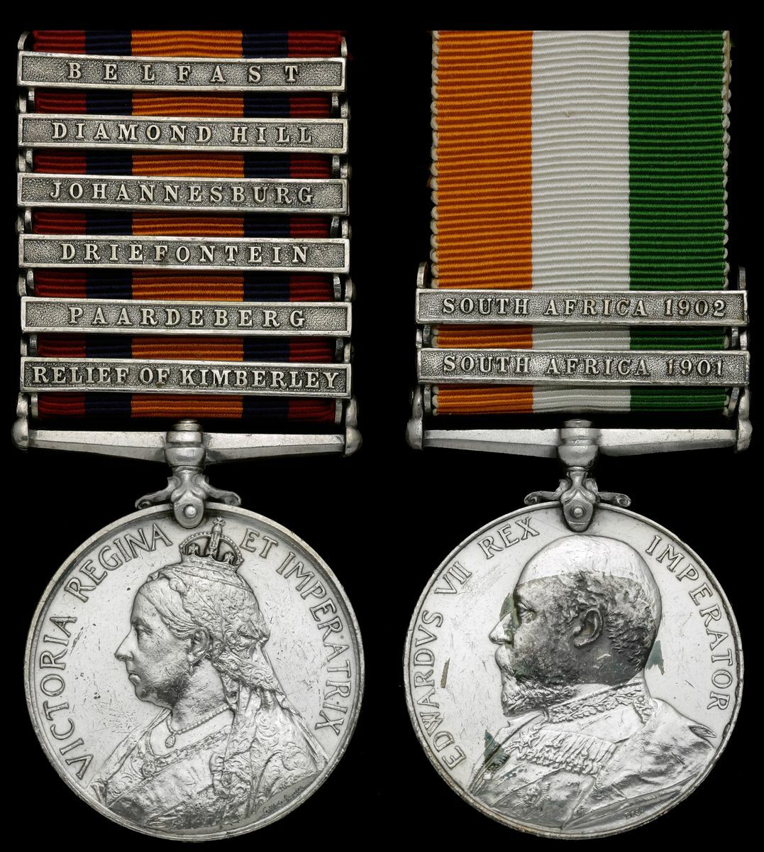 Queen's South Africa 1899-1902, 6 clasps, Relief of Kimberley, Paardeberg, Driefontein, Johannesburg, Diamond Hill, Belfast (2648 Pte H. Edney, 1st Essex Regt); King's South Africa 1901-02, 2 clasps, South Africa 1901, South Africa 1902 (2648 Pte H. Edney. Essex Regt), sometime laquered, minor pitting, about very fine (2)