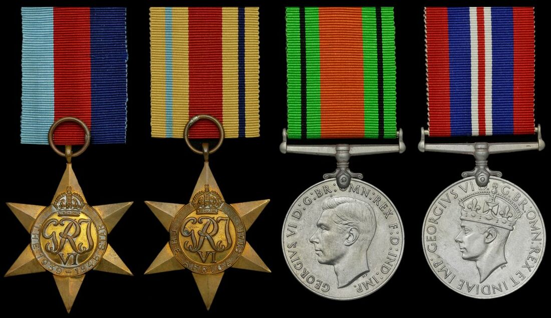 1939-45 Star; Africa Star; Defence and War Medals 1939-45, in card box of issue with Air Council slip and ticker-tape confirming awards, nearly extremely fine (Lot)