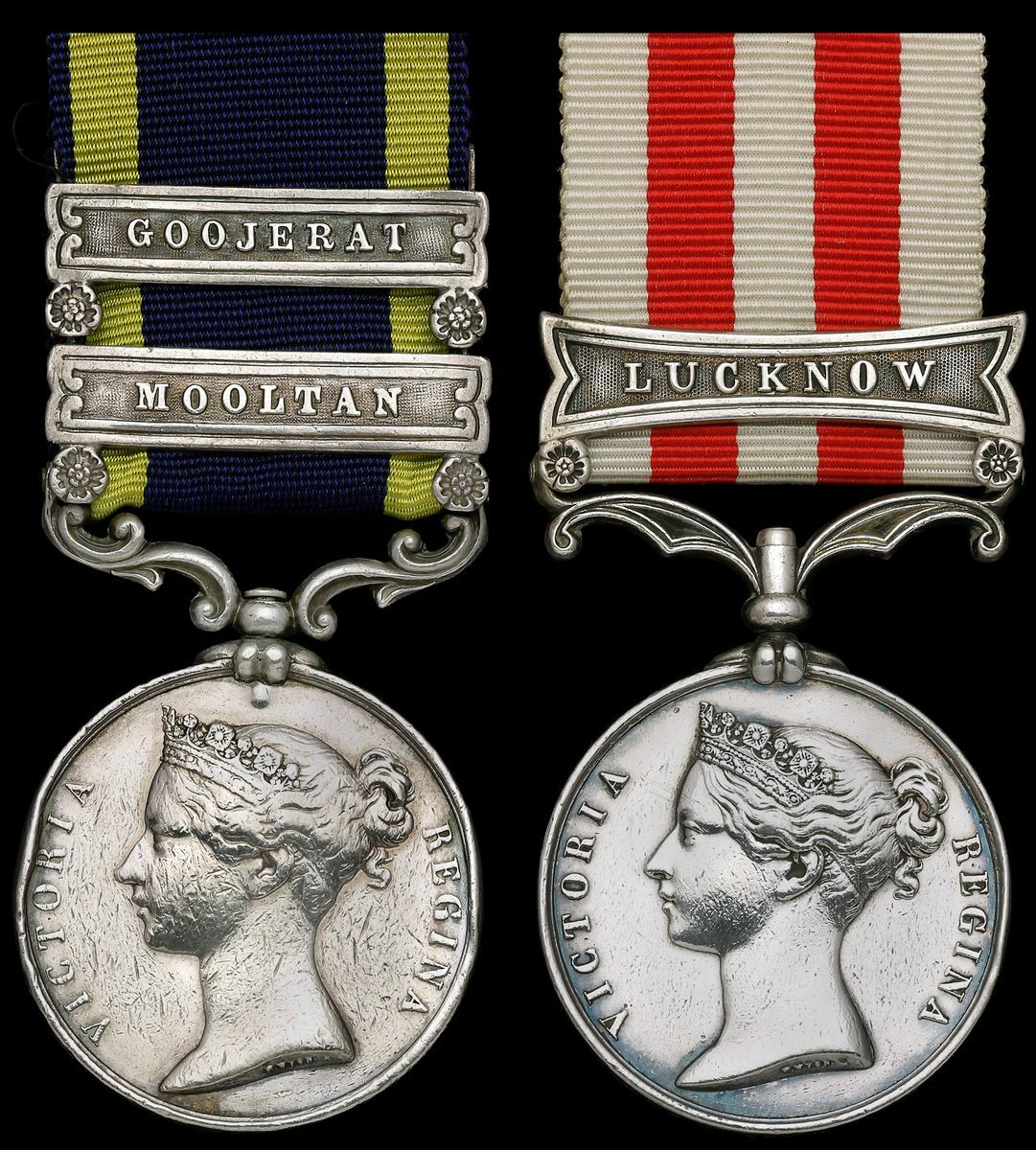 Punjab 1848-1849, 2 clasps, Mooltan, Goojerat (John Costello. 10th Foot.); Indian Mutiny 1857-59, 1 clasp, Lucknow (J, Costello, 1st Batn 10th Regt), heavy contact wear and edge wear, nearly very fine (2)
