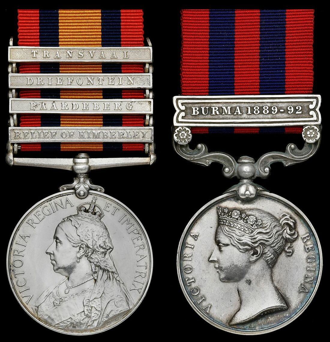 India General Service 1854-95, 1 clasp, Burma 1889-92 (2902 Pte Henry 2d Bn Magill Oxford Shire L. I.); Queen's South Africa 1899-1902, 4 clasps, Relief of Kimberley, Paardeberg, Driefontein, Transvaal (2902. Pte. H. Magill. 1/Oxfd:L.I.), good very fine (2)