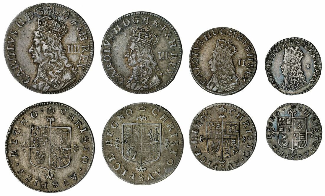 Charles II (1660-1685), Milled Issues, Undated Maundy Set, crowned bust left, with falling lace collar, rev. shield over cross moline (ESC 2365; Bull 590; Spink 3391), rub to the highest points, otherwise with a residual lustre to darkly toned surfaces, pleasing very fine
