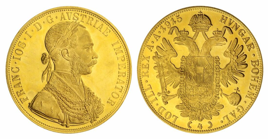 (g) Austria-Hungary, Franz Josef (1848-1916), Restrike 4-Ducats, 1915, laureate and uniformed bust right rev. crowned imperial double eagle, milled edge, 13.96g, 12h (KM 2276), hairlines to fields, otherwise with proof-like surfaces, near extremely fine