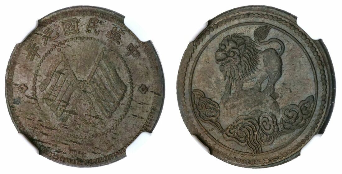 NGC MS62 BN | *Top Pop* | China, Szechuan, Republic, 'Dancing' Type, 5 Cash, Year 1 (1912), Nián Yuán Guómín Huázhong, crossed flags, rev. dancing lion facing left and down, clouds below, plain edge, 12h (CCC 434; Hsu 314; Duan 1743; L&M 371; KM Y441), haymarked to the reverse as typical for this type and some faint contact marking in parts, otherwise with a pleasing glossy lustre, extremely fine, in NGC holder, graded MS62 BN (Cert. #4629310-003), incorrectly labelled on the holder as being the lion looking up variety