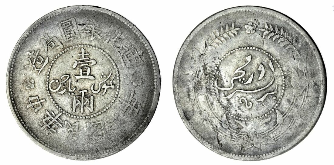 China, Xinjiang Province (Sinkiang), Republic, 'Year Six' Small-Rosette Sar or 'Gümüsh Liang' Tael, 1917, Type 1, Urumchi/Tihwa [Dihua] Mint, small rosette and wheat wreath around, Chinese characters both sides, edge milled, 34.75g, 4h (KM Y45; L&M 837; WS 1319; Kann 1265), partially stained and flawed with peripheral striking softness, otherwise very fine