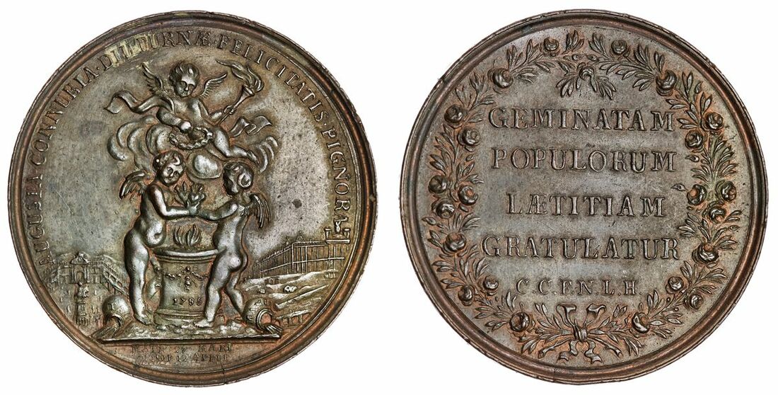 (x) Portugal, Marriage of Infante John with Princess Charlotte Joaquine de Bourbon and Infanta Maria Anna Vittoria with Prince Gabriel Antonio of Spain, AE Medal, 1785, by J. Gaspar, AUGUSTA CONNUELA . DIUTURNAE . FELICITATIS . PIGNORA, cherubs gather around altar with flaming hearts, rev. GEMINATAM POPULORUM LAETITIAM GRATULATUR C . C . F . N . L . H ., within floral wreath, 42mm, 21.59g (Lamas 75), some deposits to darkened surfaces, otherwise bolder very fine
