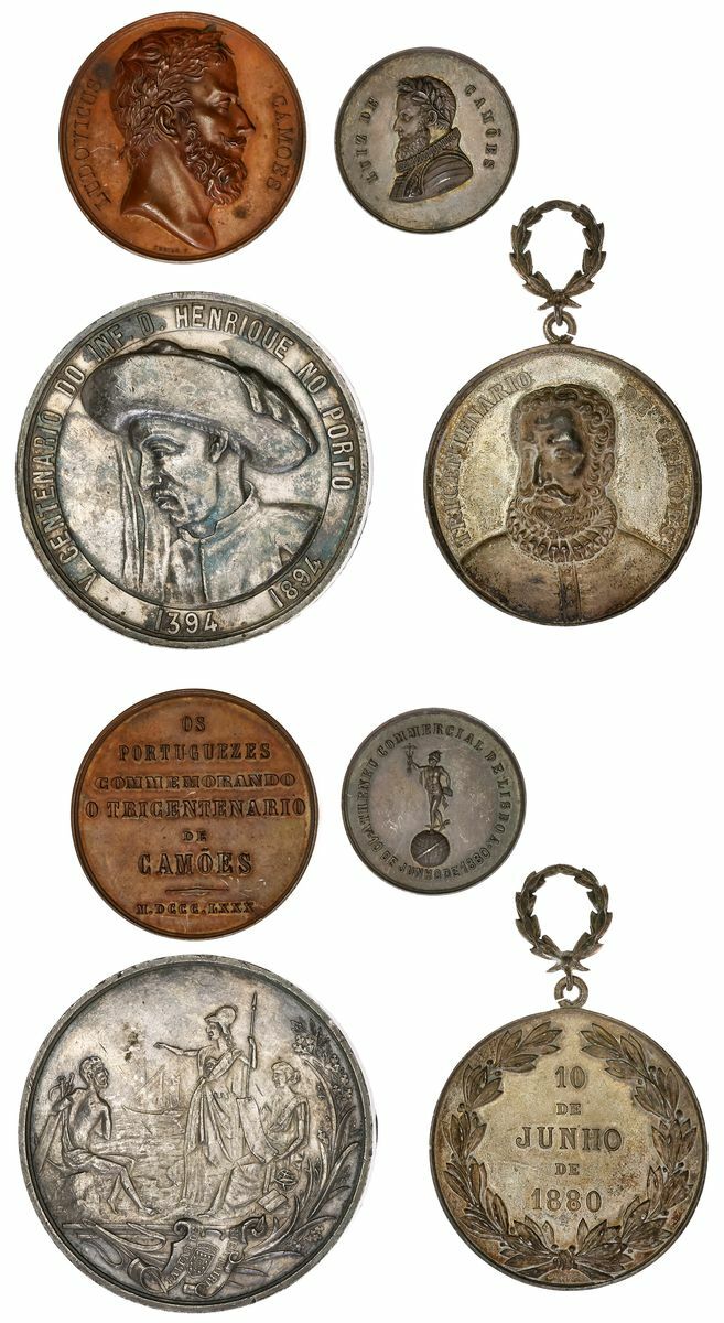 (x) Portugal, Tricentenary of the Death of Luís de Camões, AR Medal, 1880, by Maia, LUIZ DE CAMOES, draped and laureate bust left, rev. . ATHENEU COMMERCIAL DE LISBOA . 10 DE JUNHODE 1880, Hermes stands upon the globe, 31mm, 17.94g (Lamas 213), with a most pleasing flashy cabinet tone and lustre, handsomely struck up in high relief, extremely fine; and, Portugal, Tricentenary of the Death of Luís de Camões, AE Medal, 1880, by Feeire, LUDOVICUS CAMOES, laureate bust right, rev. seven line inscription, 42mm, 40.25g (Lamas 202), some carbon spotting to otherwise pleasing light brown fields, good extremely fine; also, Portugal, Tricentenary of the Death of Luís de Camões, AR Medal, 1880, unsigned, TRICENTENARIO DE CAMOES, draped three-quarters bust left, rev. 10 DE JUNHO DE 1880 within wreath, 46mm, 43.56g (Lamas 196), a touch of rub to otherwise lightly toned surfaces, with laurel wreath suspension loop, good very fine; another, Portugal, 500th Anniversary of the Death of Prince Henry the Navigator, AR Medal, 1894, unsigned, V CENTENARIO DO INF. D. HENREIQUE NO PORTO 1394 1894, draped bust left, rev. three figures looks out sea and distant ship, arms on banner before, 59mm, 107.47g (Lamas 263/66), contact marked, yet toned, very fine (4)