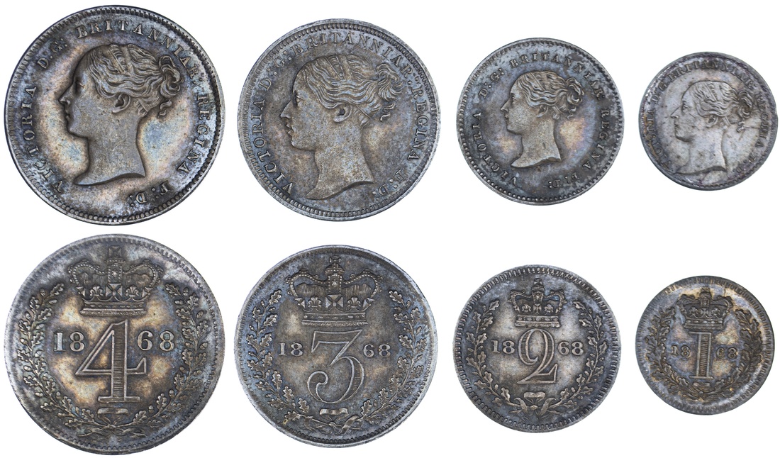 (x) Victoria (1837-1901), 'Young Head' Maundy Set, 1868, young head left, rev. crowned mark of value, edges plain (Bull 3518; ESC 2480; Spink 3916), some softness to the higher points and once cleaned, now with a dark tone, good very fine to extremely fine, in damaged original case of issue (4)