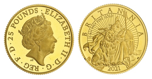 (g) NGC PF66 ULTRA CAMEO | Elizabeth II (1952-2022), Commemorative Britannia Gold Proof 25-Pounds, 2021, by Jody Clark and P J Lynch, sixth crowned head right, by Jody Clark, rev. BRITANNIA, Britannia and English Lion seated facing, edge milled, 22mm., .999 Fine, 7.80g, 12h, light fingermarks and a small mark before face, otherwise choice brilliant uncirculated with sharp cameo definition, in NGC holder, graded PF66 ULTRA CAMEO (Cert. #6769433-016)