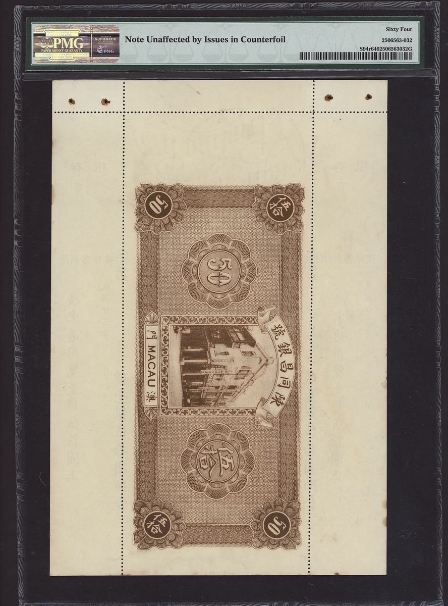 (x) Chan Tung Cheng Bank, Macau, [Top Pop] remainder 50 Sollars, 1934, (Pick S94r), in PMG holder 64 Choice Uncirculated, note unaffected by issues in counterfoil