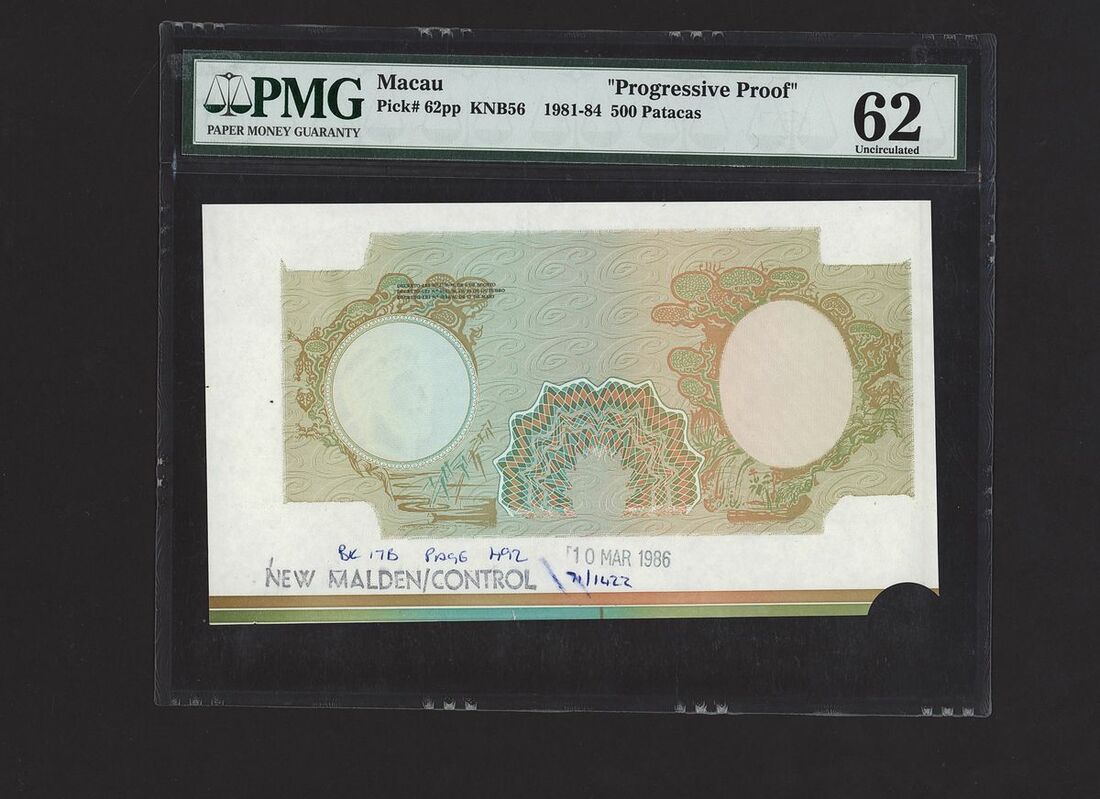 (x) Macau, progressive proof for 500 Patacas, 1981-84, (Pick 62pp, BNB 059, KNB 56), in PMG holder 62 Uncirculated, printer´s annotations, small tear