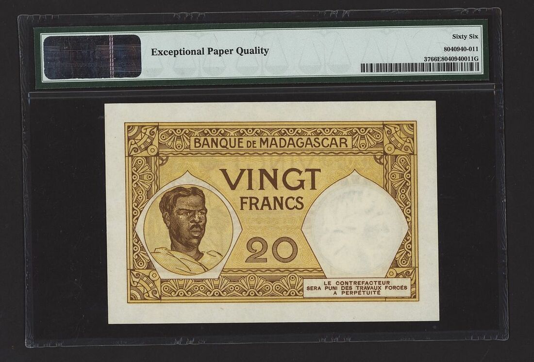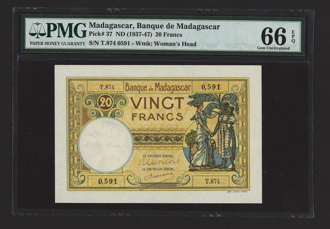 (x) Banque de Madagascar, 20 Francs, ND (1937-47), serial number T.874 0591, (Pick 37, BNB 204), in PMG holder 66 EPQ Gem Uncirculated
