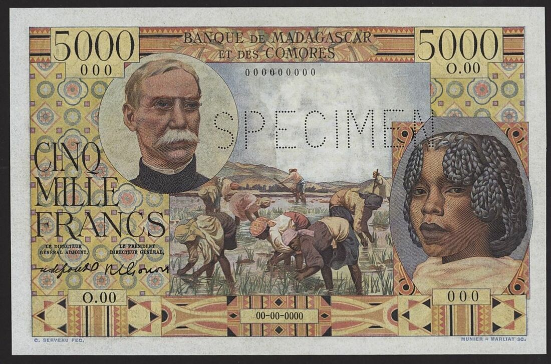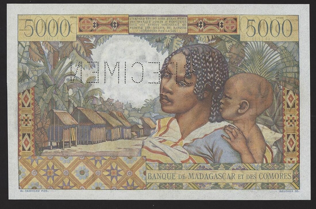 Madagascar and Comoros, specimen, 5000 francs, ND (1950-55), (Pick 49bs, BNB 105bs), typical French wavy paper, otherwise uncirculated