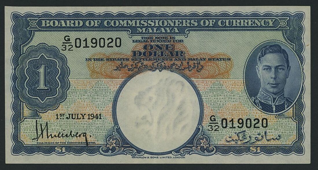Malaya, British Administration, 1 Dollar, 1st July 1941 (1945), serial number G/32 019020, Board of Commissioners of Currency
