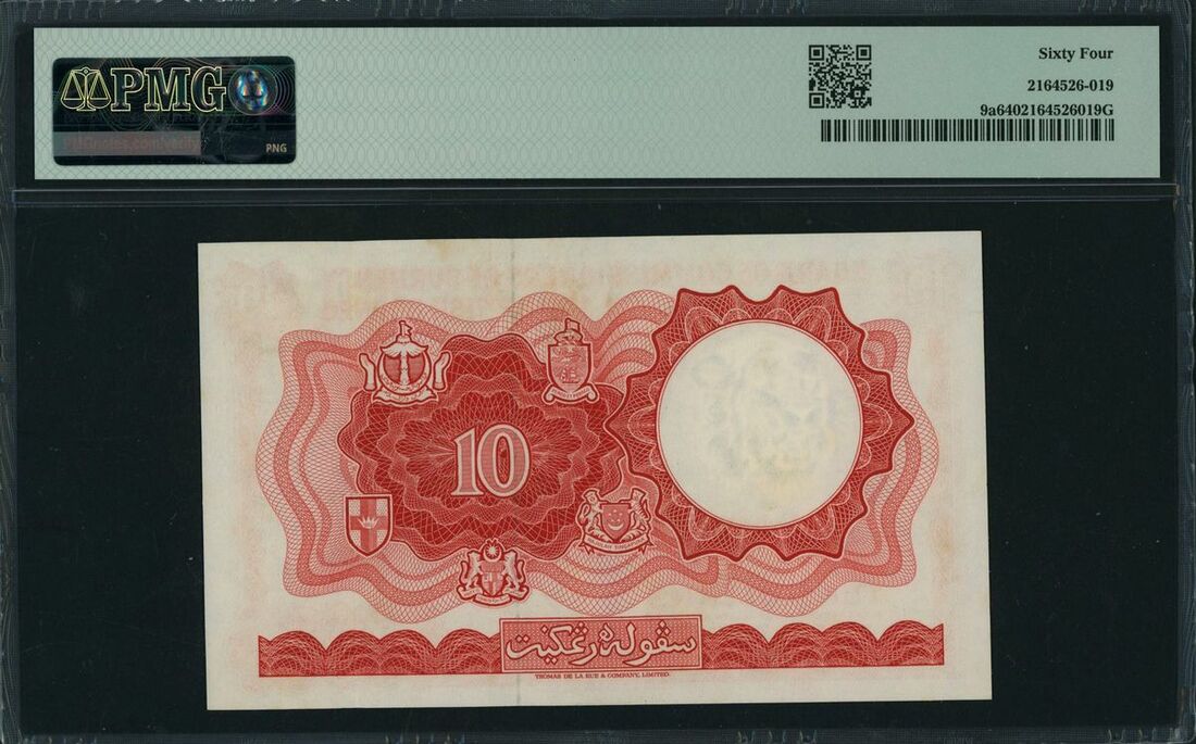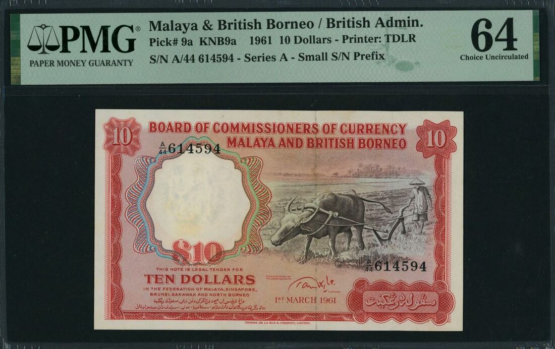 Malaya and British Borneo, $10, 1st March 1961, serial number A/44 614594, (Pick 9a, BNB 109a), in PMG holder 64 Choice Uncirculated
