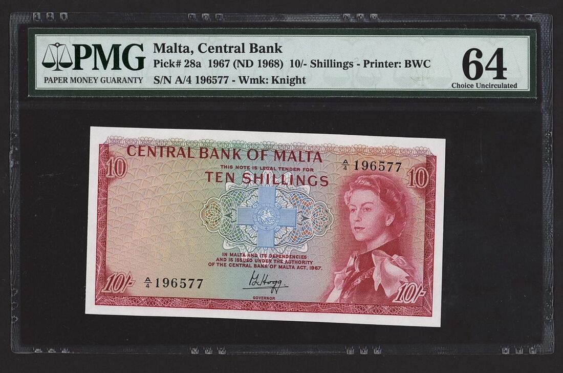 Malta, Central Bank, 10/-, ND (1968), serial number A/4 196577, watermark: knight