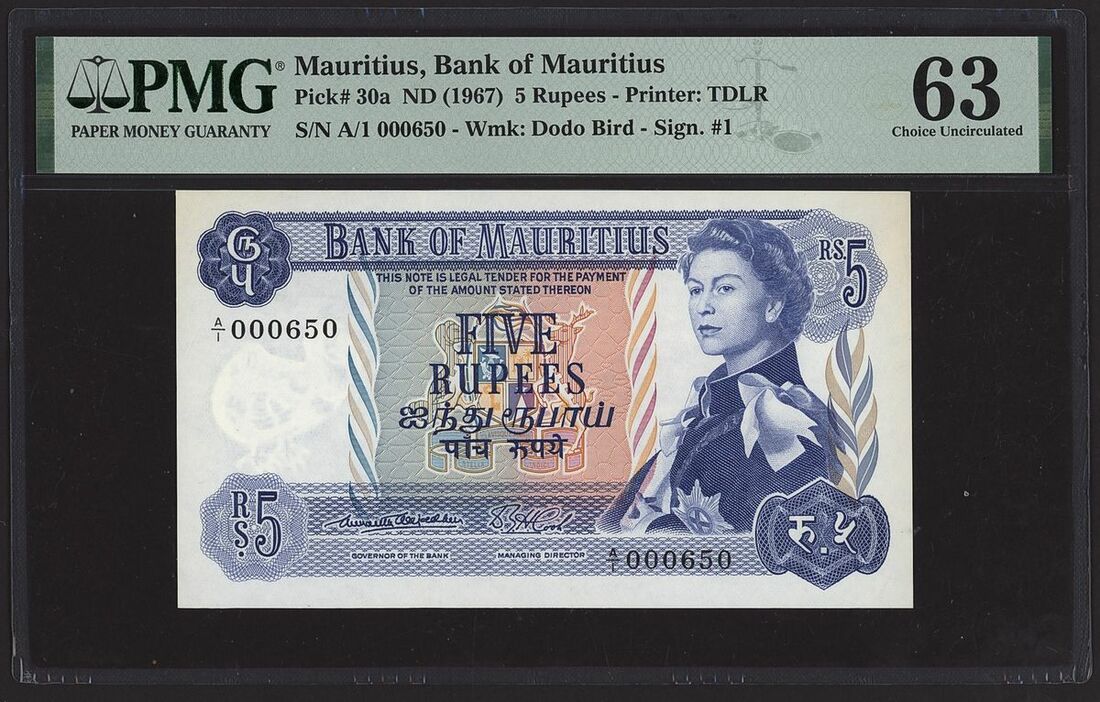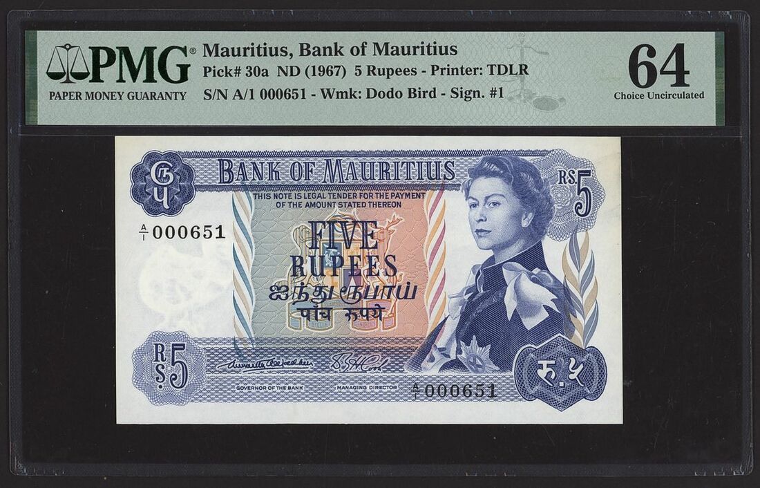 (x) Bank of Mauritius, consecutive pair of 5 Rupees, ND (1967), serial numbers A/1 000650-51, (Pick 30a, BNB 401), in PMG holder 64 Choice Uncirculated (1), 63 Choice Uncirculated, minor stains (1), (2 notes)
