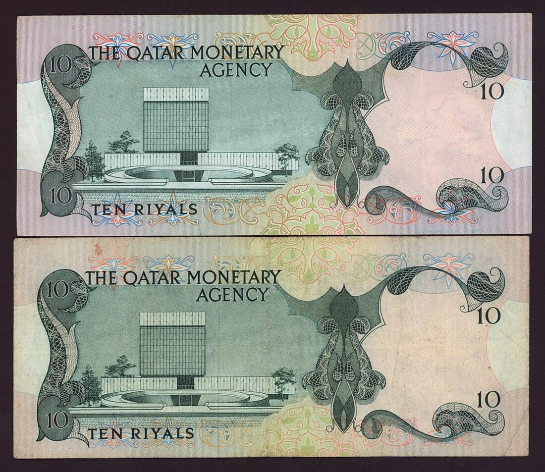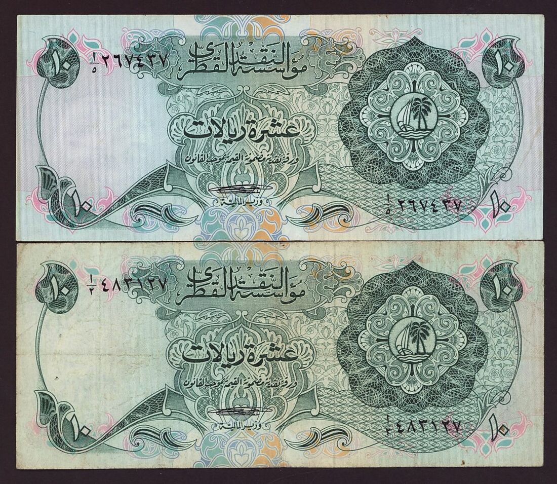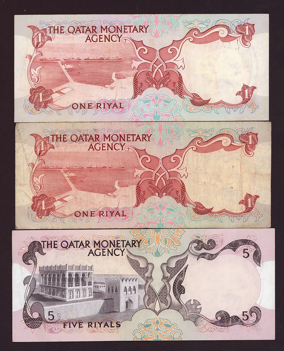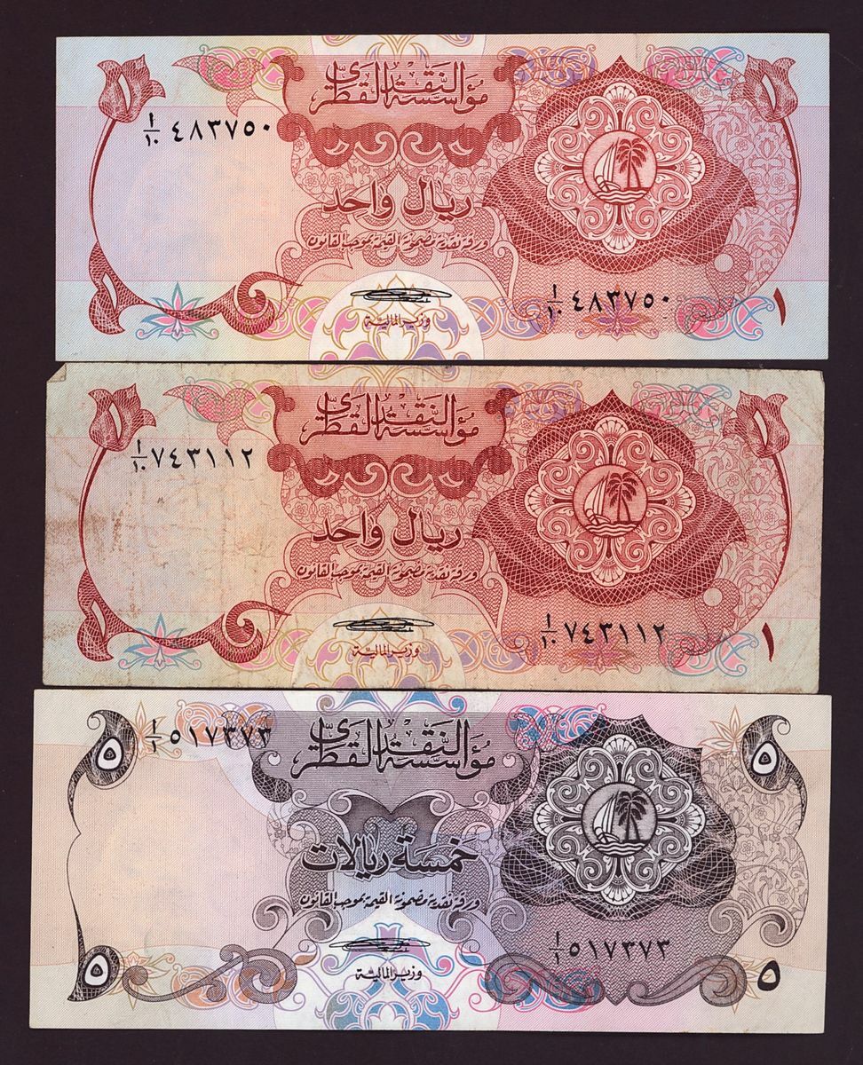 The Qatar Monetary Agency, Qatar 10 riyals (2), 5 riyals (1), 1 riyal (2) (1973), (Pick 3, 2, 1), about fine to about very fine (5 notes)