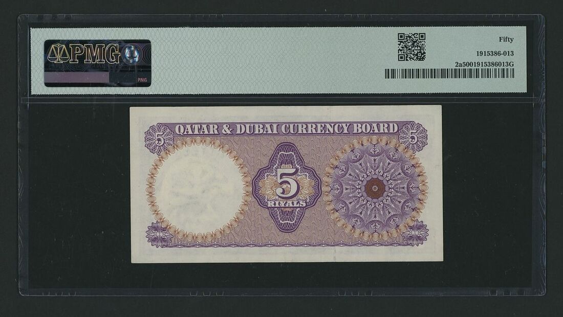 Qatar & Dubai Currency Board, 5 Riyals, 1966, serial number A/4 224486, (Pick 2a, BNB 102), in PMG holder 50 About Uncirculated