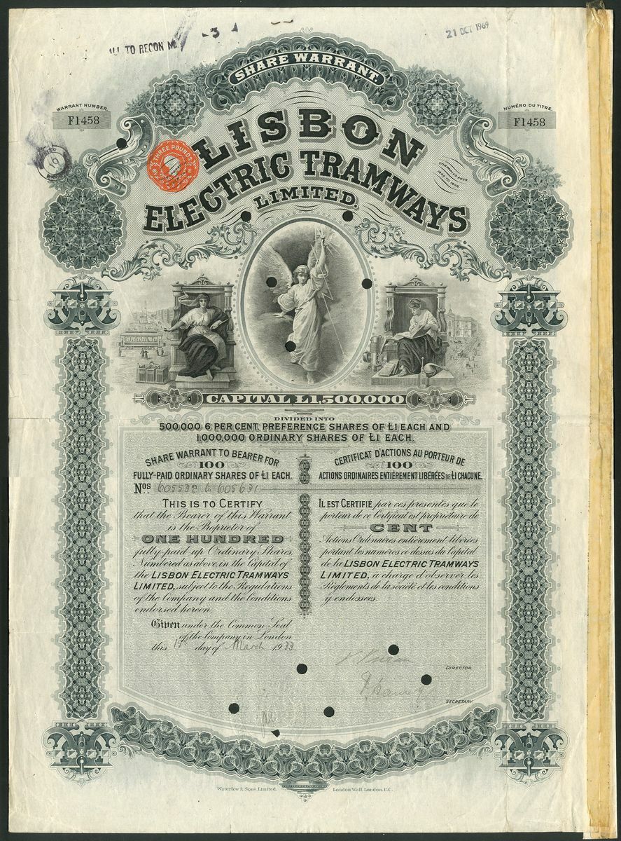 Portugal: Lisbon Electric Tramways Ltd., 100 ordinary shares of £1, London 19[33], #F1458, capital £1,500,000, large format piece with allegorical figures in centre, ornate border, grey, printed by Waterlow & Sons, hole cancelled, without coupons. The first of the electric tramways in the city, built by this English company formed in 1899. The Company imported and operated tramcars from the USA. A few edge tears, AVF. A rare denomination.