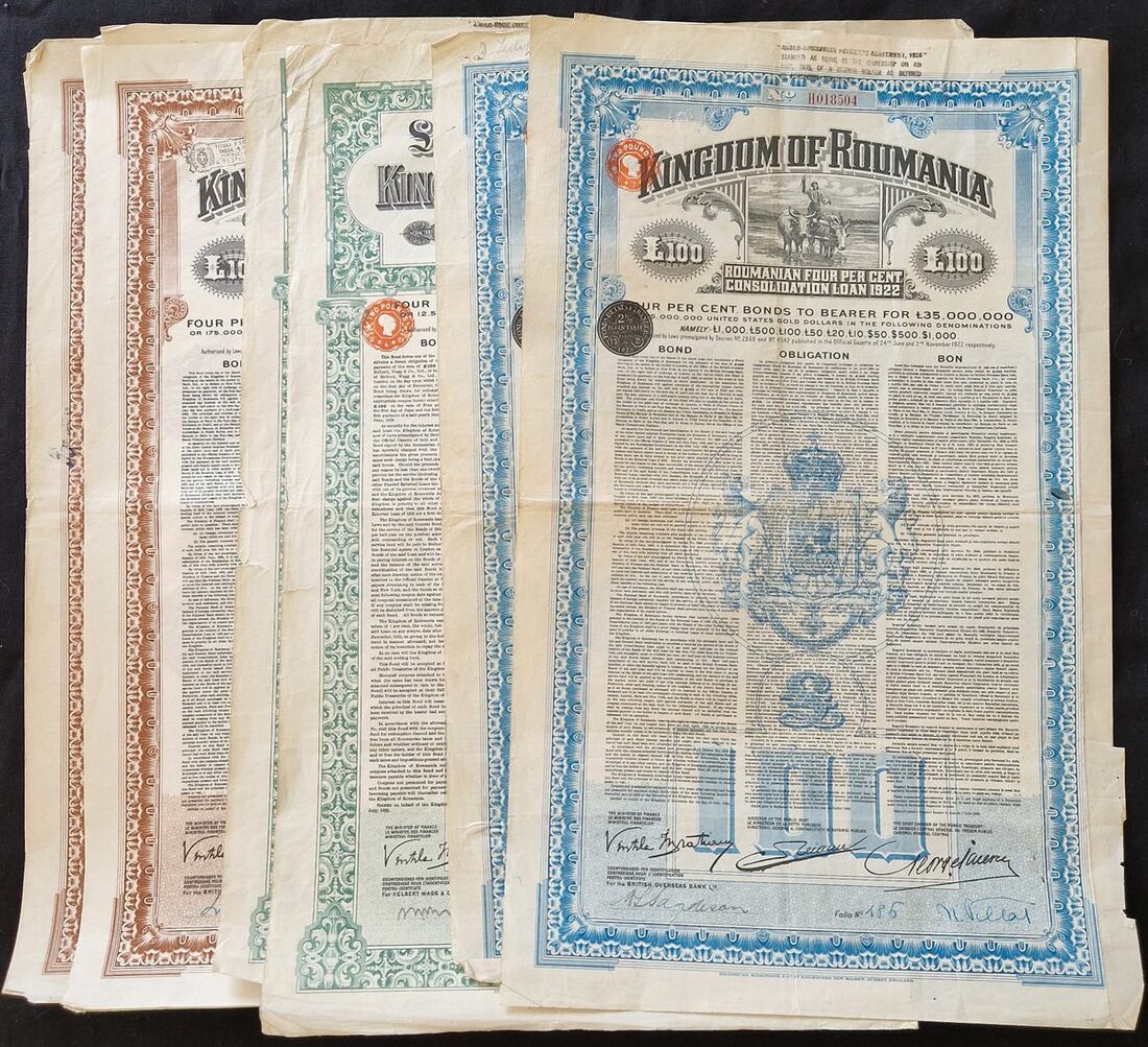 Roumania: A group of 10 Government bonds, comprising 1922 4% External Loan, £100 bonds, 2 examples; 1922 4% Consolidation Loan, £100, blue series H, 2 examples and £100, brown, series C, 5 examples, and, 1929 Monopolies Institute, £100. All with coupons. Some creases but most are VF or thereabouts (10).