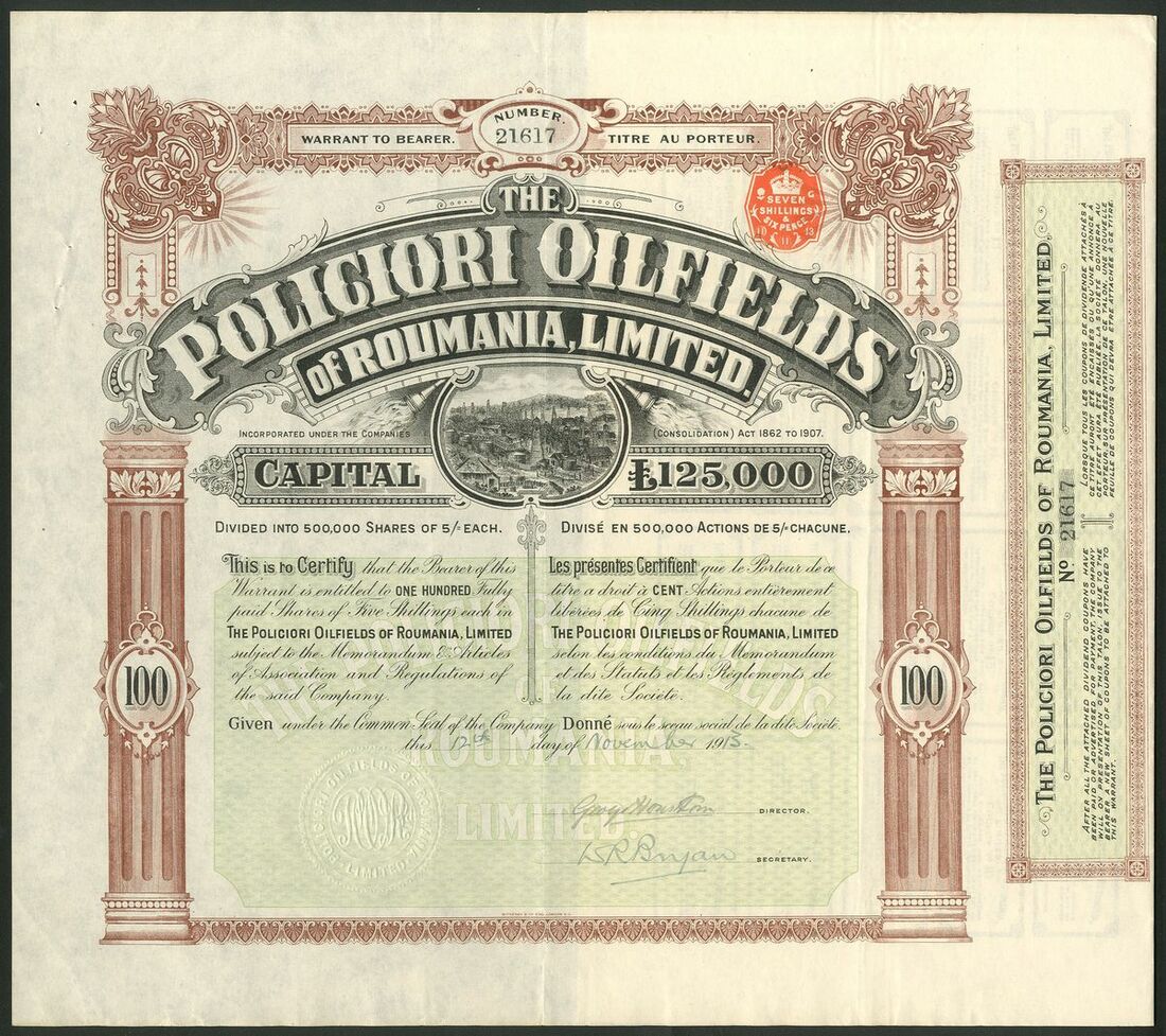 Roumania: Policiori Oilfields of Roumania Limited, 100 shares of 5/-, 19[13], #21617, vignette of oilfield in centre, text in English and French, brown and green, with coupons, VF and scarce.