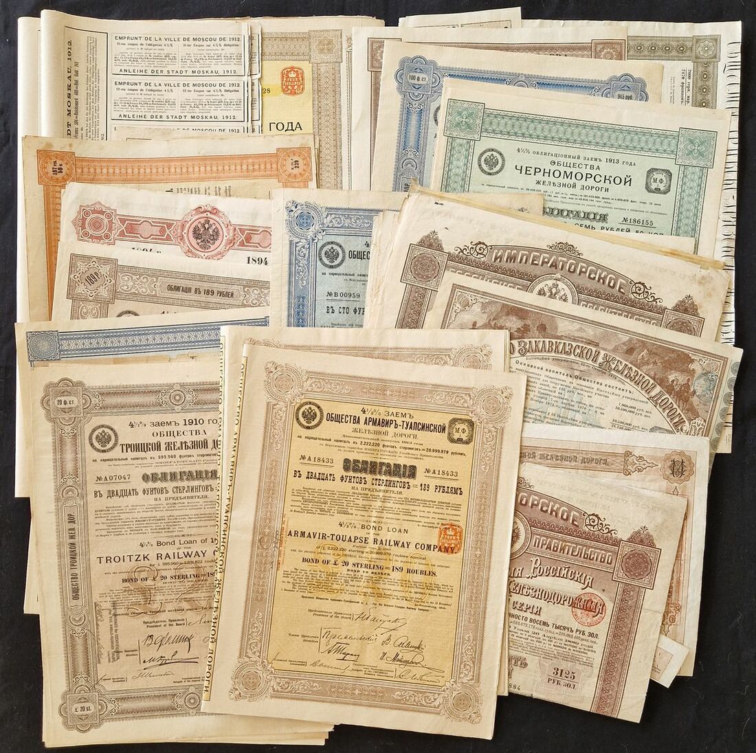 A large group of Russian State, City and Railway bonds, with some duplication, including City of Moscow, 1912, £20 bonds, 48 examples. Also includes Wolmar, 1910, £20 and £100, these with edge tears, and Consoidated Railway Loan, 2nd series, 1889, 3125 roubles. See images for more detail. Mixed condition, fine to VF and better (approx 105).
