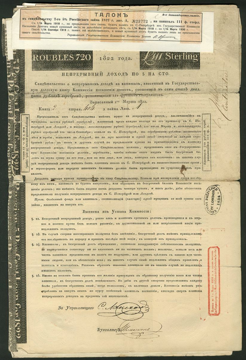 Russia: 1822, 5% 'Rothschild' Loan, 4 bonds for 720 roubles or £111, handsigned by Nathan Meyer Rothschild as Contractor, double headed eagle at top, black, on poor quality paper. All with splits at folds, fair to fine (4).