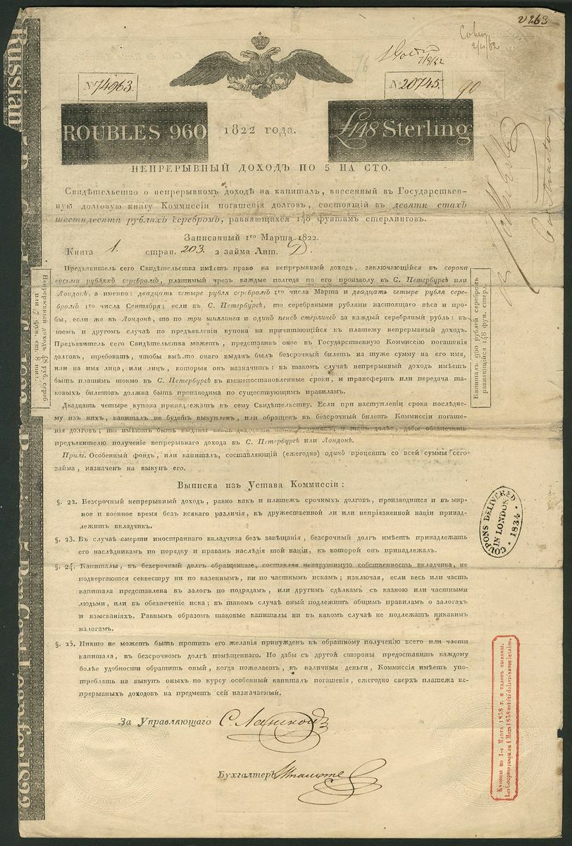 Russia: 1822, 5% 'Rothschild' Loan, bond for 960 roubles or £148, handsigned by Nathan Meyer Rothschild as Contractor, double headed eagle at top, black, on poor quality paper, lacks talon. GF.