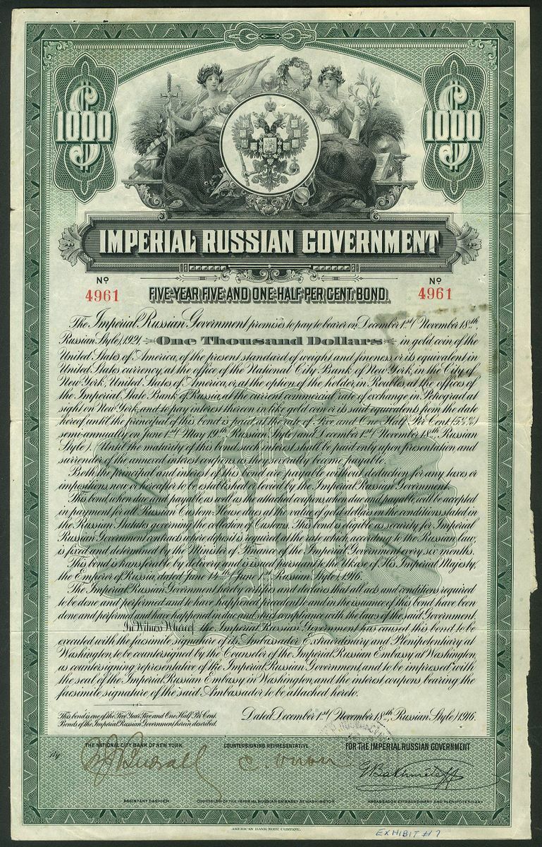 (x) Imperial Russian Government, 5½% loan $1000, 1916, #4961, with coupons, double headed eagle flanked by female allegories, green and black, printed by the American Bank Note Co. VF.