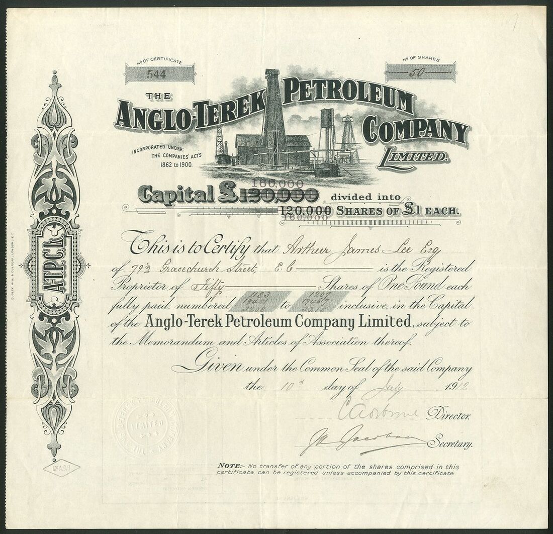 Russia: Anglo-Terek Petroleum Company Limited, £1 shares, 19[12], #544, new capital overprinted, vignette of oil wells, black. Held two 27-acre oil fields in the area of Grozny, near the Caspian Sea. VF and rare. This type not seen before.