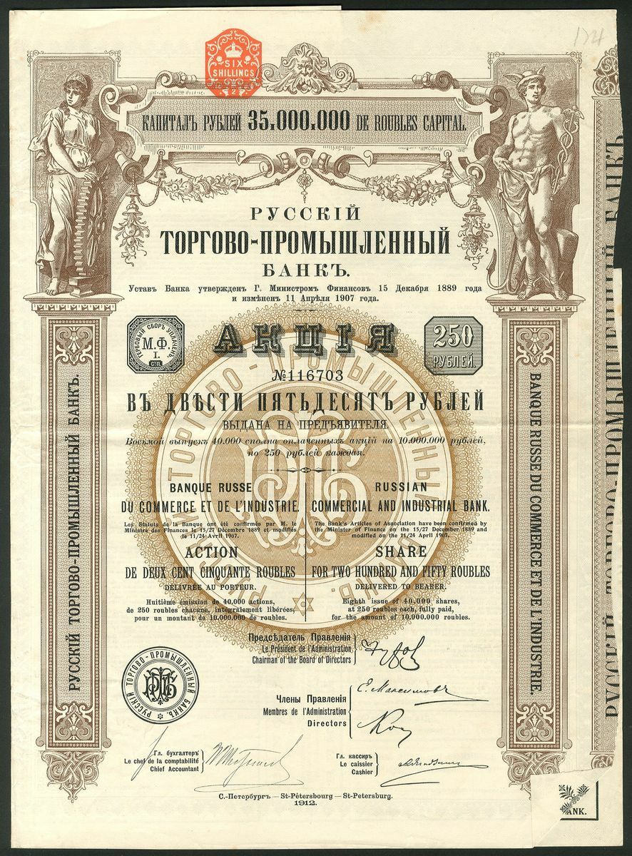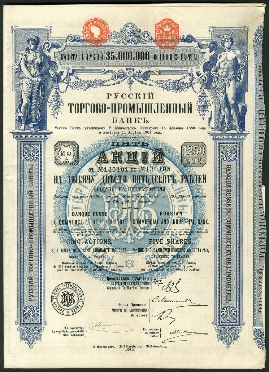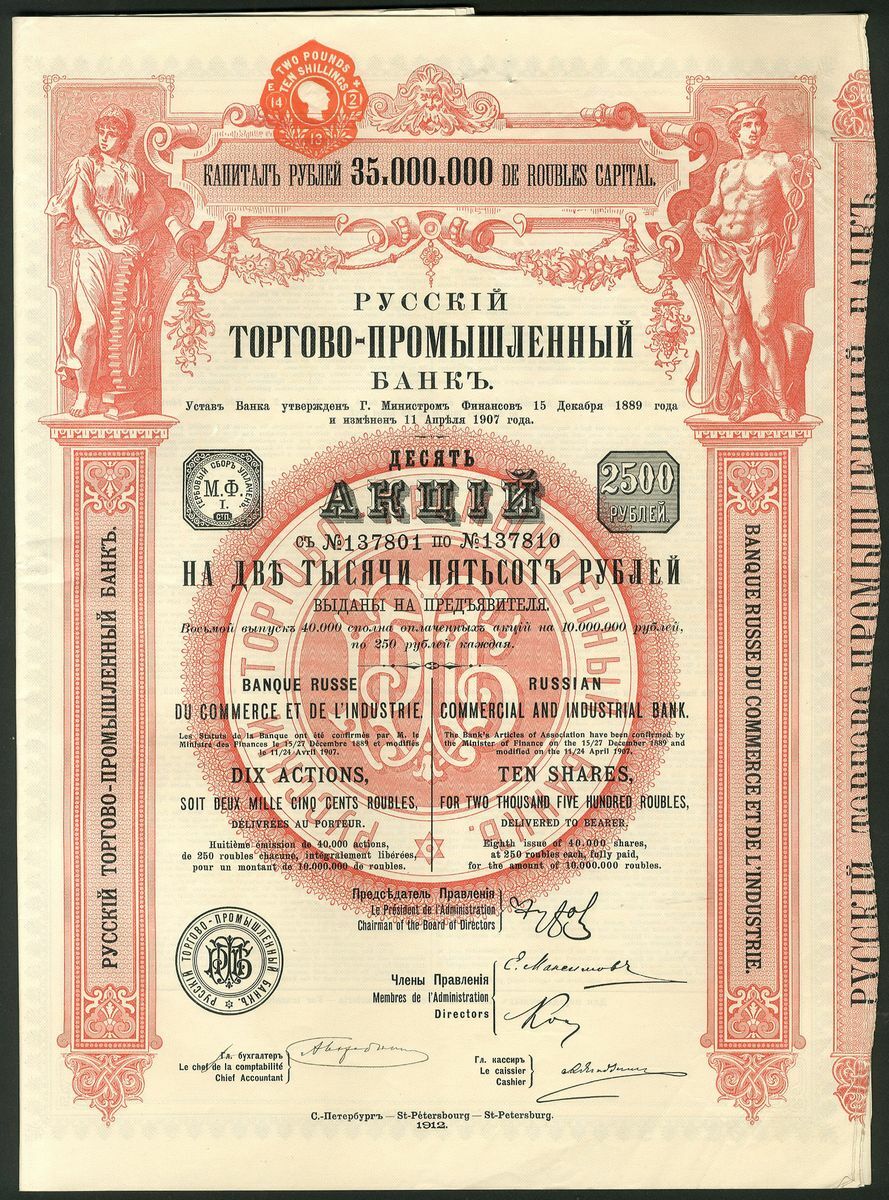 Russia: Banque Russe du Commerce et de L'Industrie (Russian Commercial and Industrial Bank), a group of certificates for 1 share, 5 shares (7) and 10 shares (4), all 8th issue, St.Petersburg 1912, brown, blue and red respectively, allegorical figures at top left and right, text in Russian, French and English, with coupons. Generally EF (12).