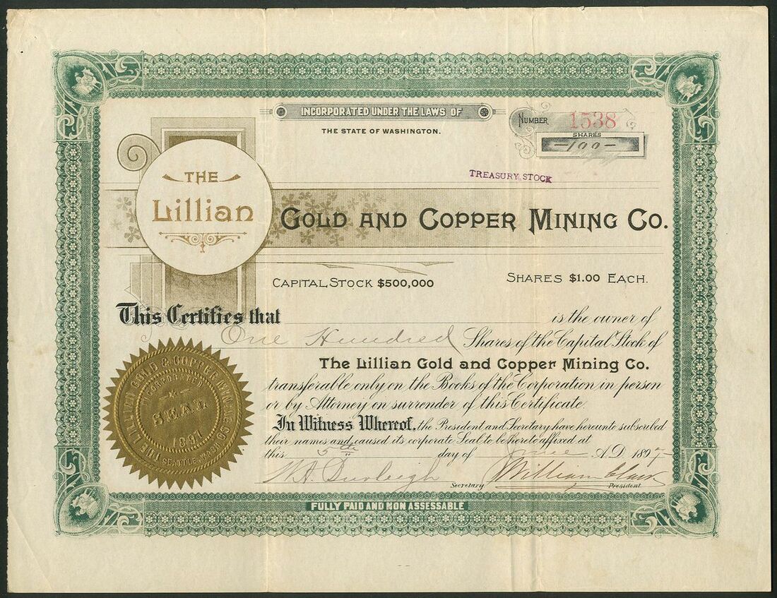 U.S.A: Lillian Gold and Copper Mining Co., $1 shares, 189[7], #1538, ornate border, black, green and gold. A Seattle, Washington Corporation formed in 1897. Location of mines not known. Slight wear to top edge, VF.