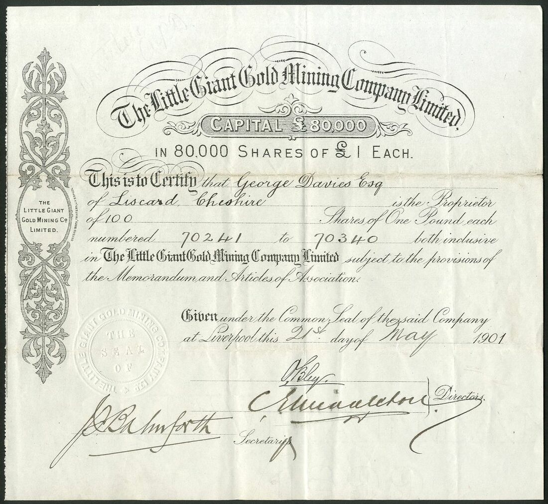 U.S.A: Little Giant Gold Mining Co. Ltd., £1 shares, Liverpool 190[1], #70241-70340, scrollwork at left, black. Acquired the Little Giant group at Baker City, near Granite, Grant County, Oregon. VF.