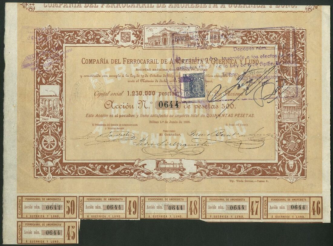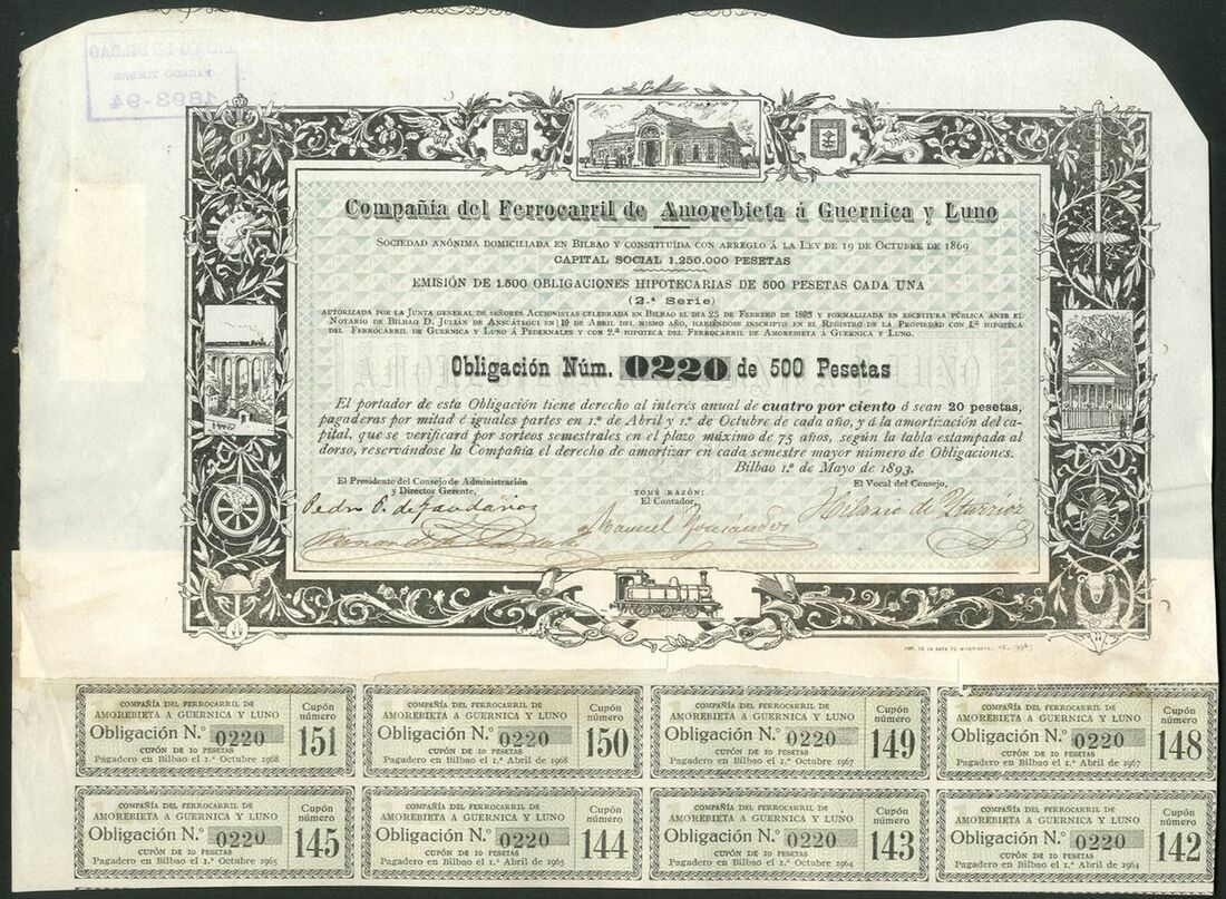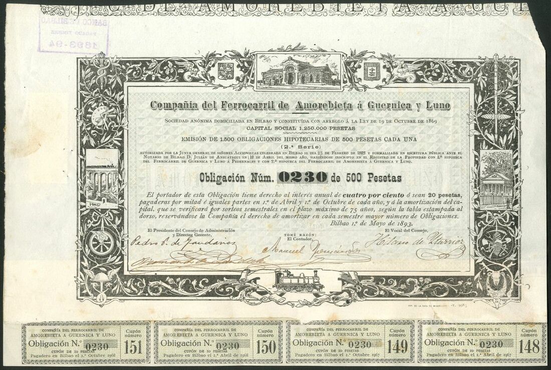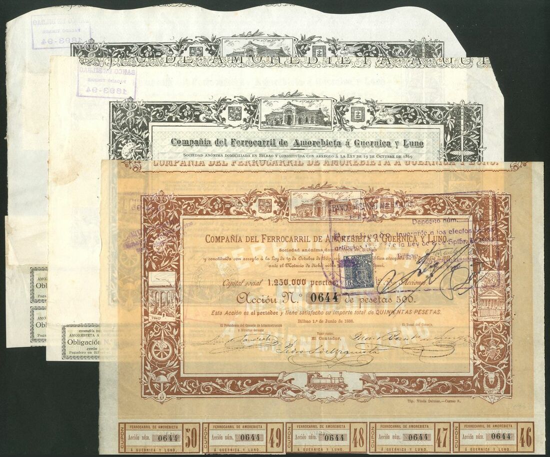 Spain: Compañia del Ferricarril de Amorebieta a Guernica y Luno, 500 peseta share, Bilbao 1888, #0644, brown and yellow, with coupons, together with 500 peseta bonds, 1893, 2 examples, #220 and #230, black, blue underprint, with coupons. VF and better (3).