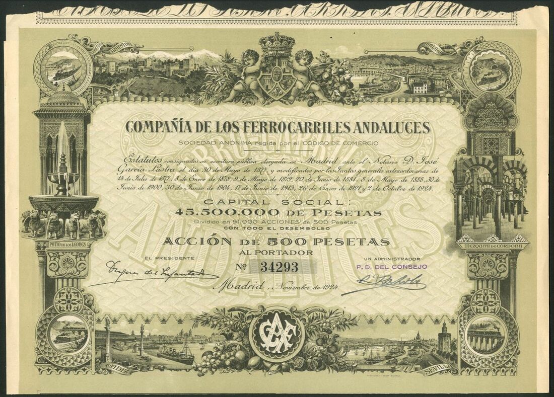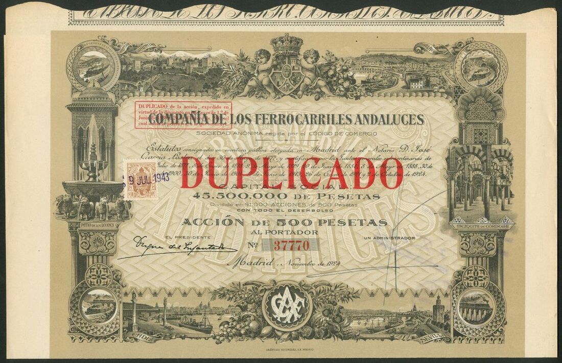 Spain: Cia de los Ferro-Carriles Andaluces, founders share, 1880, #458, attractive border, black, yellow underprint, with coupons; together with 500 peseta share, 1924, #34293 and another similar but overprinted DUPLICADO in red, #37770, issued in 1943 to replace a lost or damaged certificate, black, buff underprint, with coupons. All EF (3).