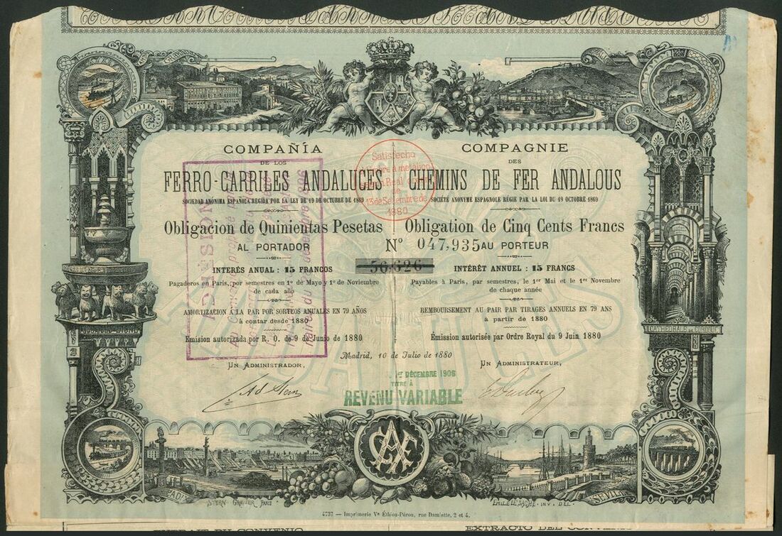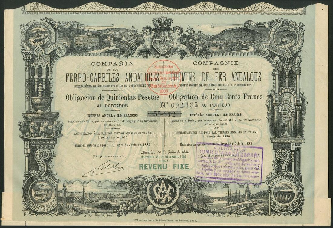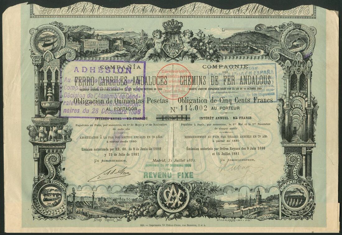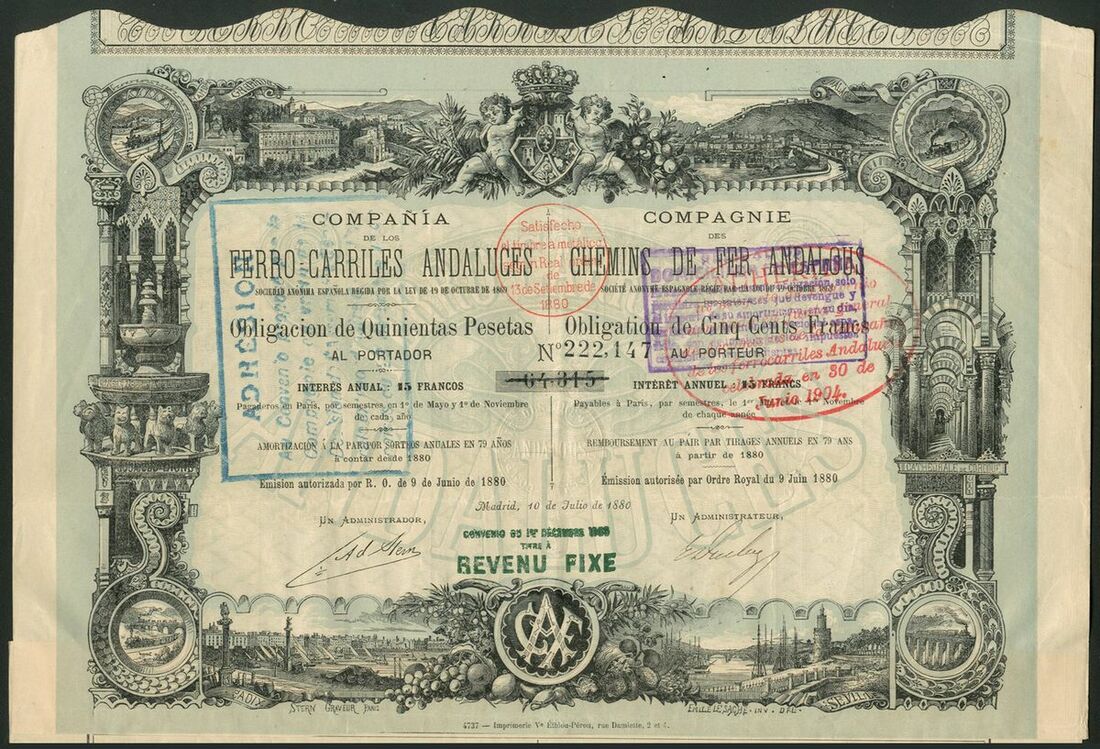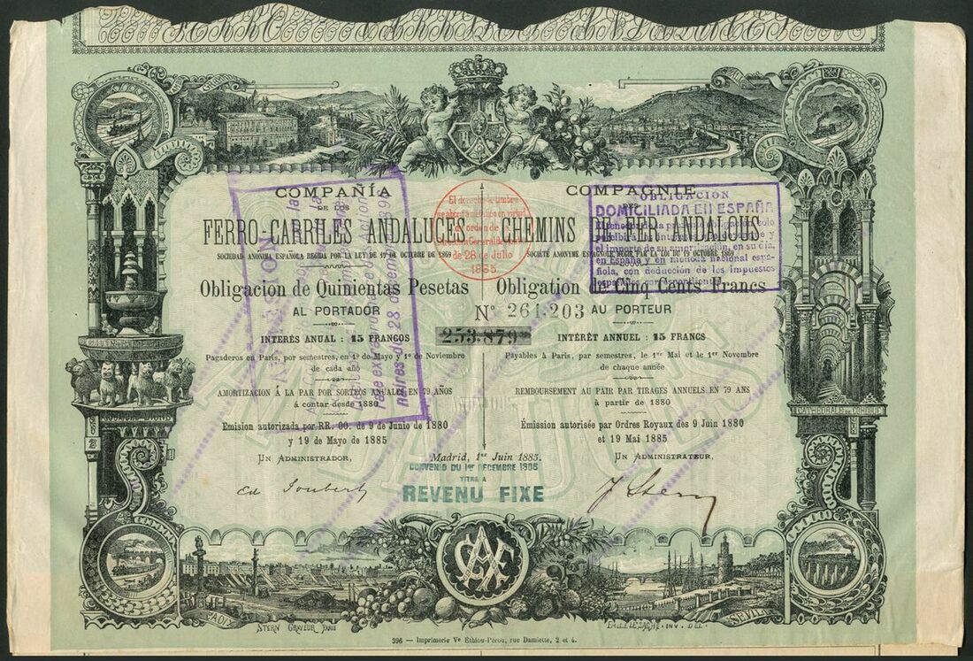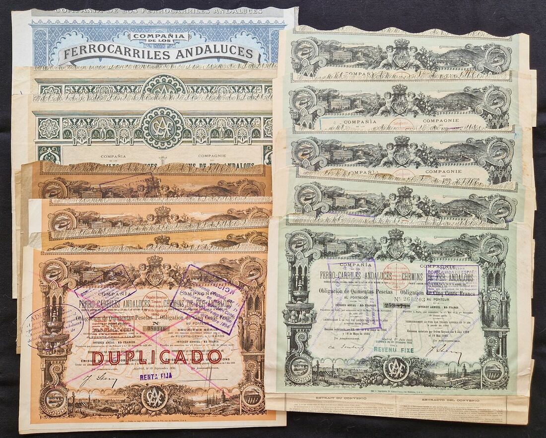 Spain: Cia de los Ferro-Carriles Andaluces, a good collection of bonds from the 1880 issue, 3 examples with different handstamps; 1881, 1885, 1890, 4 examples including 2 stamped DUPLICADO; 1907, 2 examples, and 1920. Mixed condition but most VF or better (12).