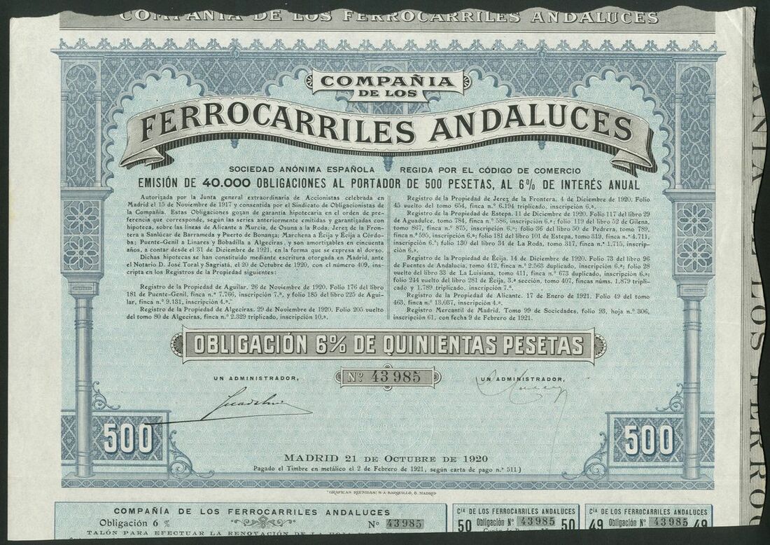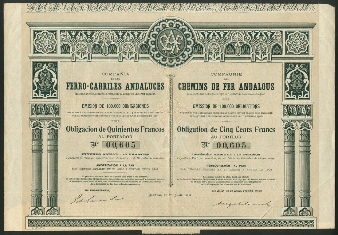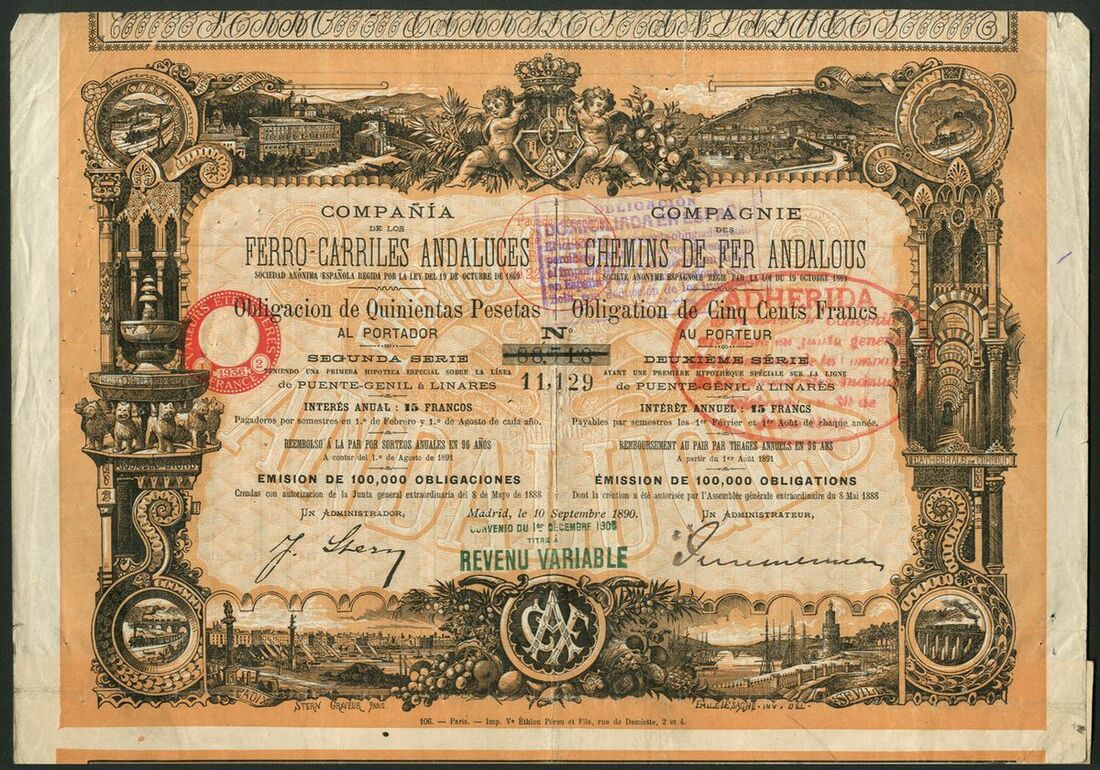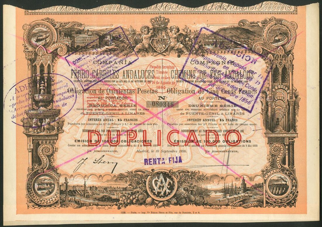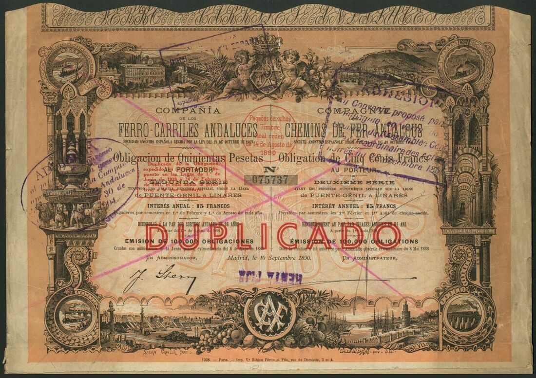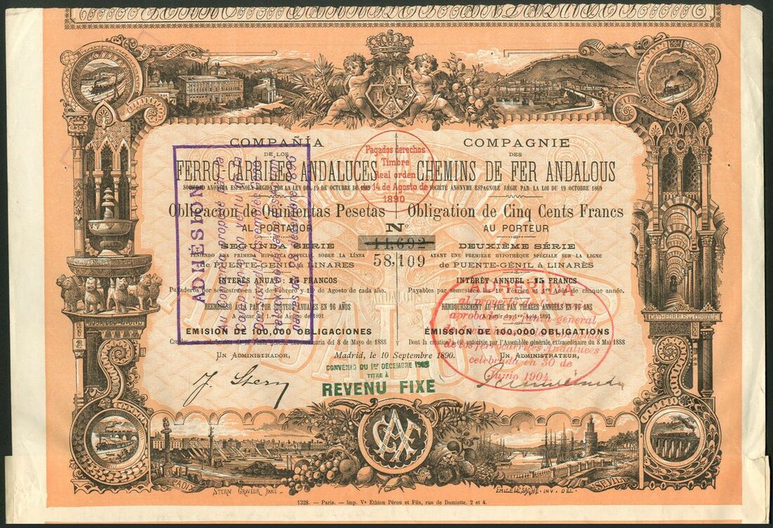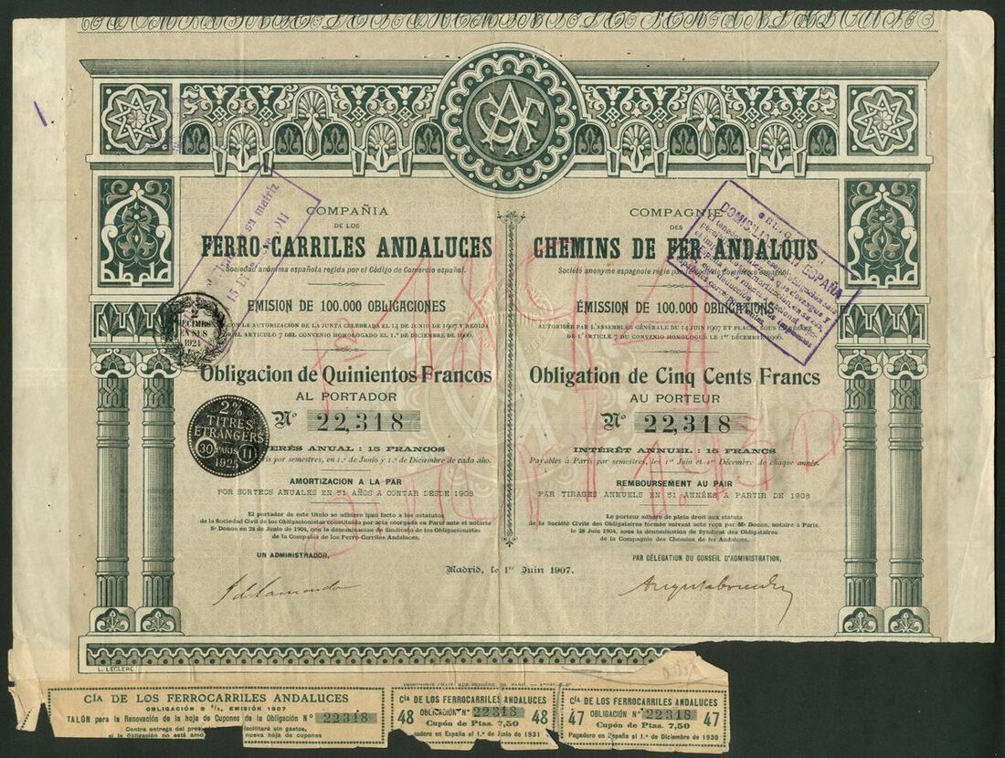 Spain: Cia de los Ferro-Carriles Andaluces, a good collection of bonds from the 1880 issue, 3 examples with different handstamps; 1881, 1885, 1890, 4 examples including 2 stamped DUPLICADO; 1907, 2 examples, and 1920. Mixed condition but most VF or better (12).