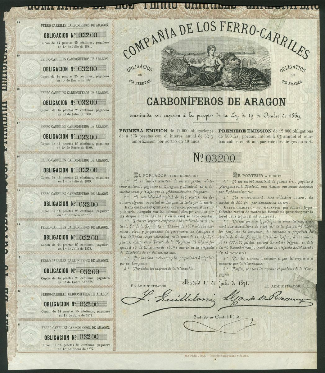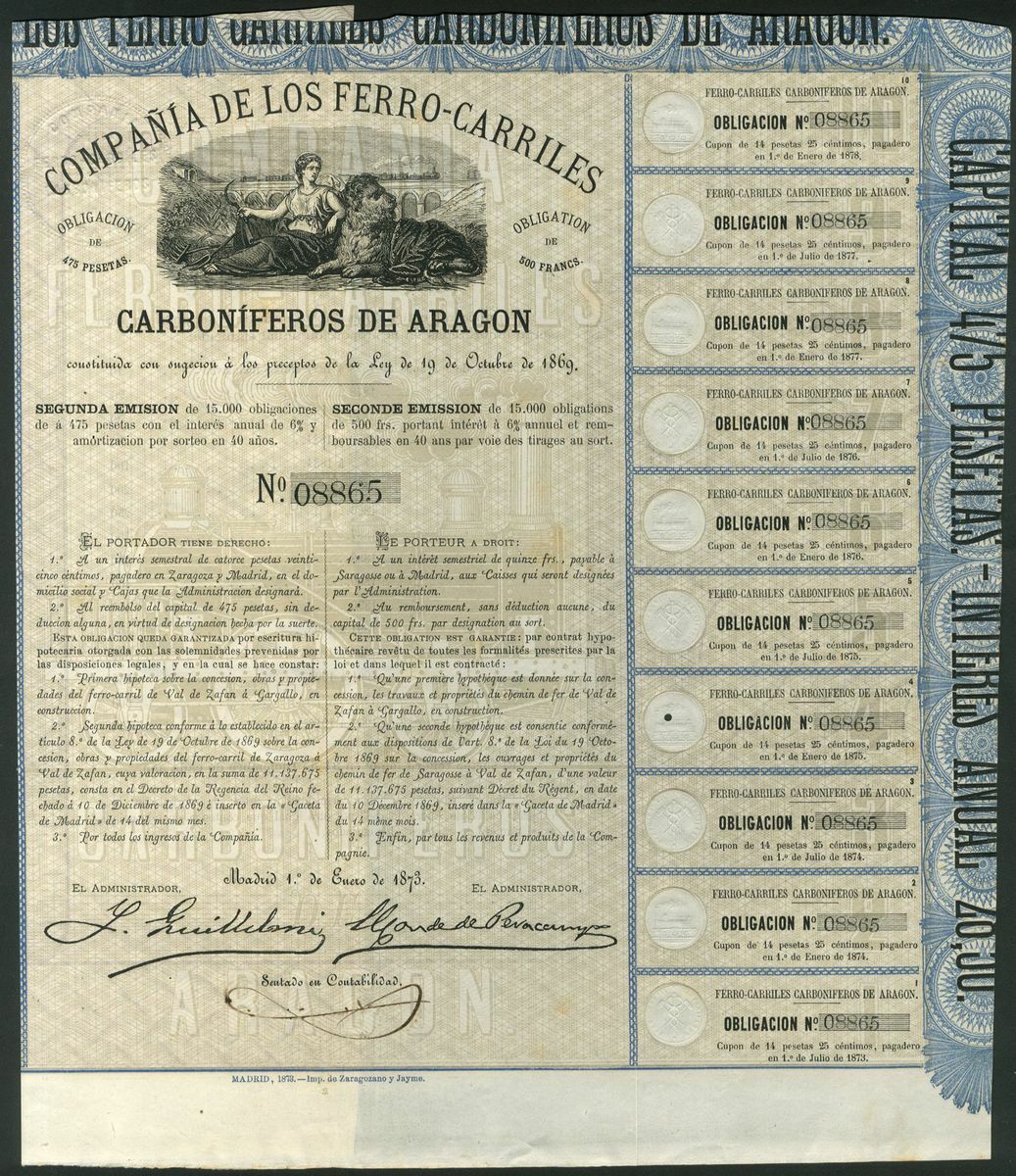 Spain: Compañia de los Ferro-Carriles Carboniferos de Aragon, pair of bonds for 475 pesetas, 1871, #03200 and 1873, #8865, both with allegorical female with lion at top, with coupons, brown and blue respectively. Line form Zaragoza to Val de Zafan. The first with a couple of repaired tears, VF and EF (2).
