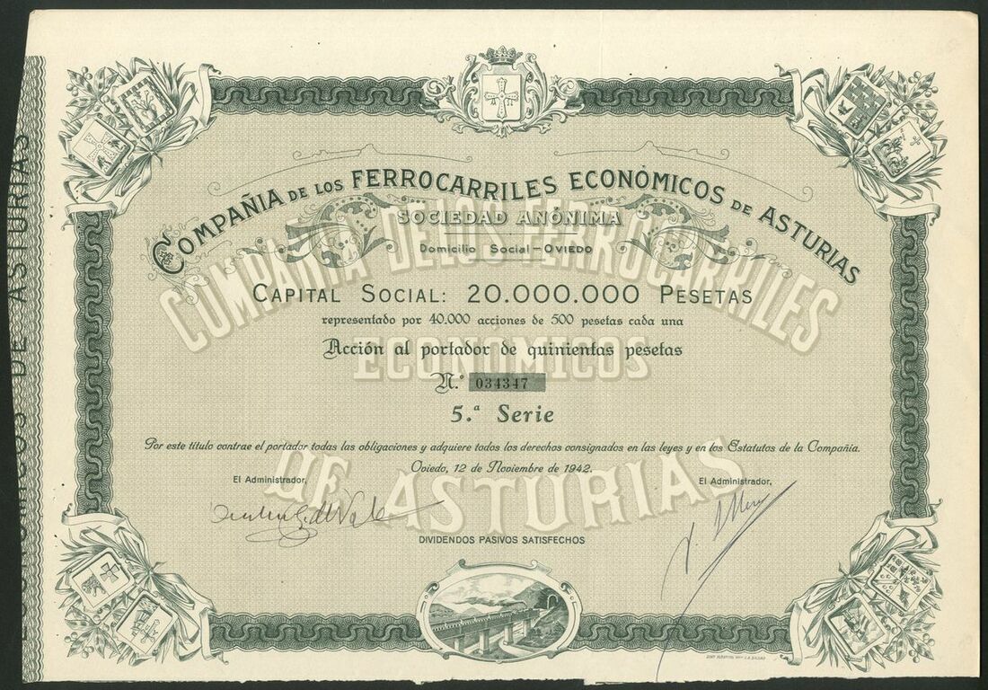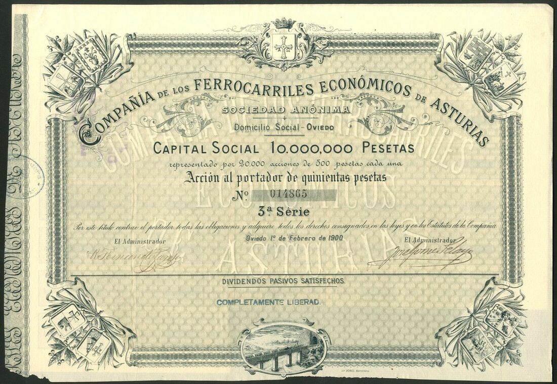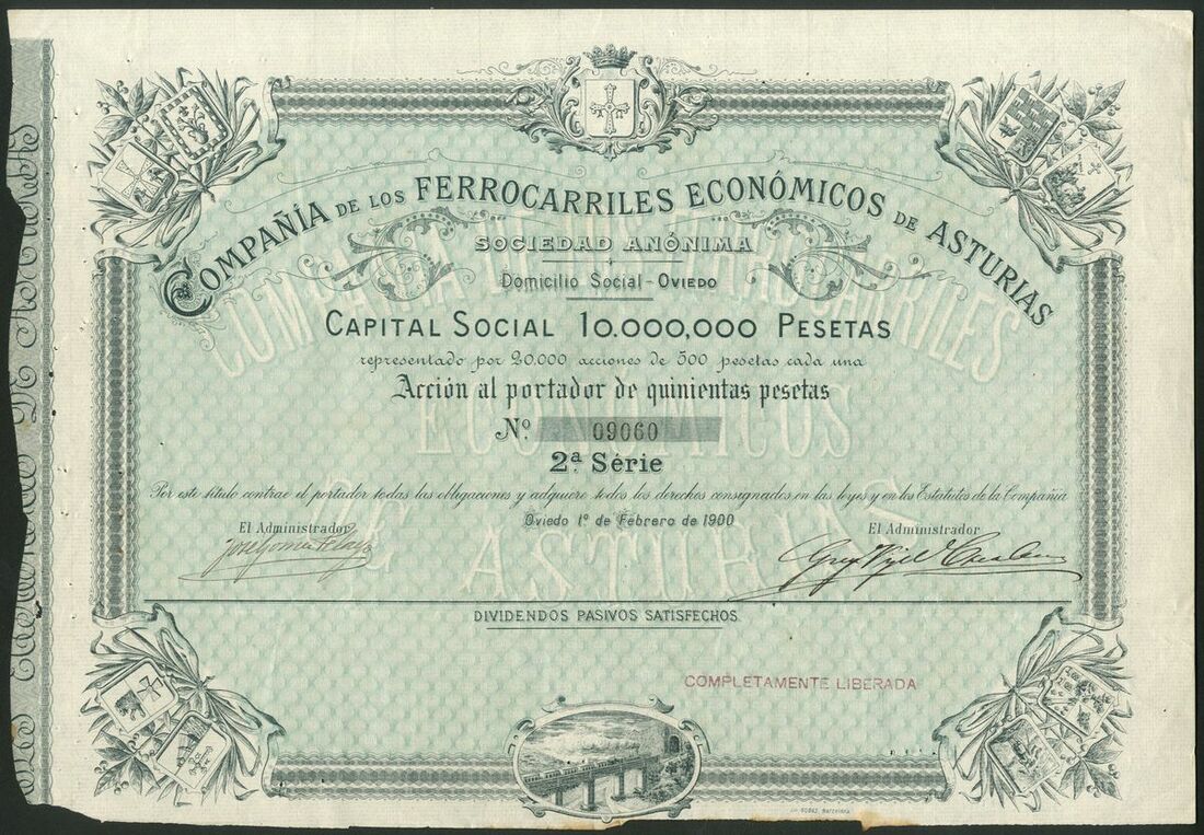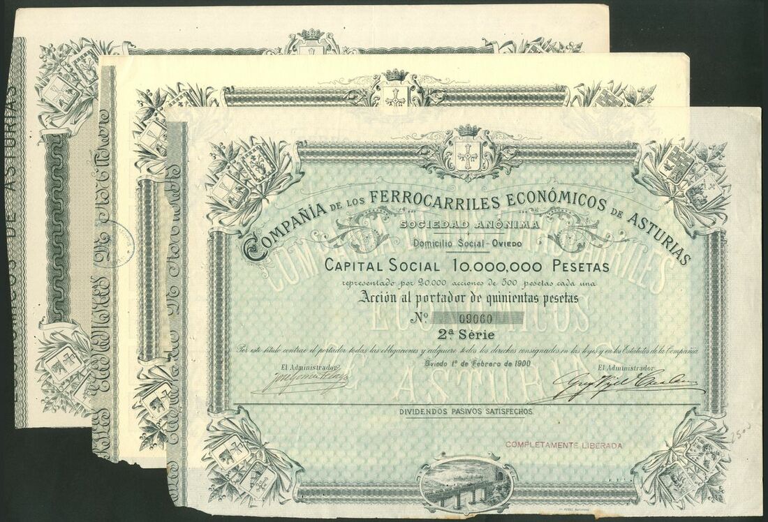 Spain: Compañia de los Ferrocarriles Económicos de Asturias, 3 certificates for 500 peseta shares, 1900, 2nd series, #9060, 1900, 3rd series, #14865 and 1942, 5th series, #34347, all with steam train on bridge at bottom and coats of arms in corners, with coupons. Narrow gauge line from Oveido to Llanes. The first with pinholes, VF to EF (3).