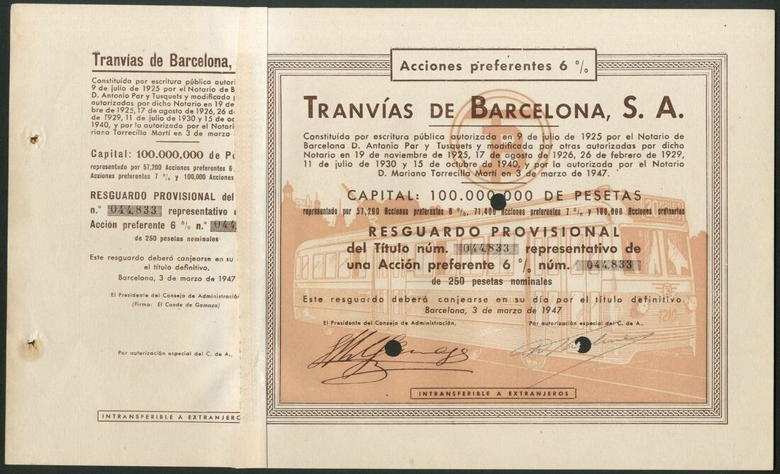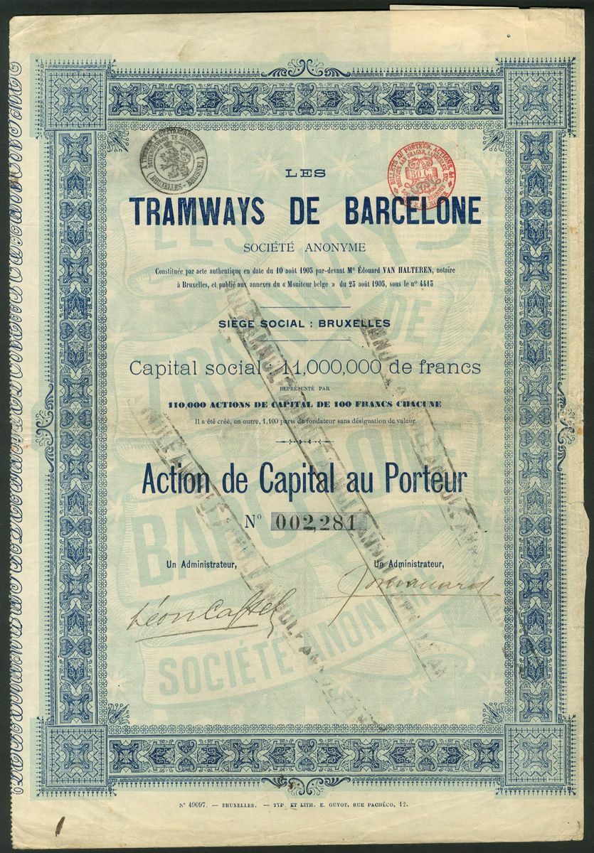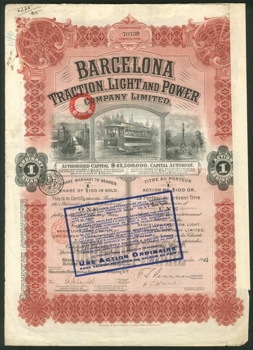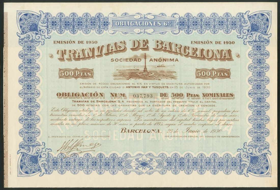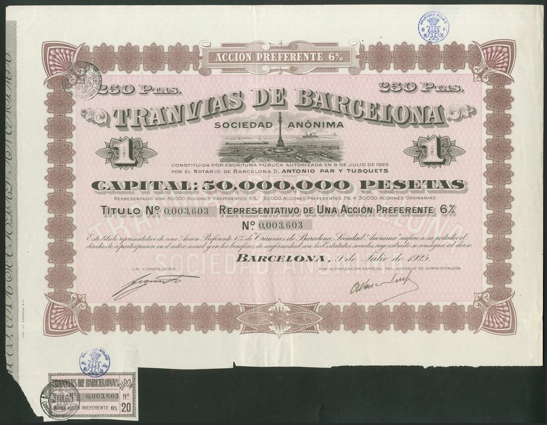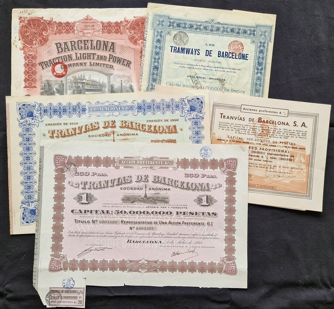 Spain: A group of certificates regarding tramways in Barcelona. Comprises Tranvias de Barcelona, 250 peseta preference share, 1925, #3603 and 6% bond, 500 pesetas, 1930, #37793, but unissued; 6% preference shares, 1947, brown, cancelled, 2 exampes; Tramways de Barcelone, action de capital, 1905, blue, cancelled, and, Barcelona Traction, Light & Power Co. Ltd., 1913. F-EF (6).